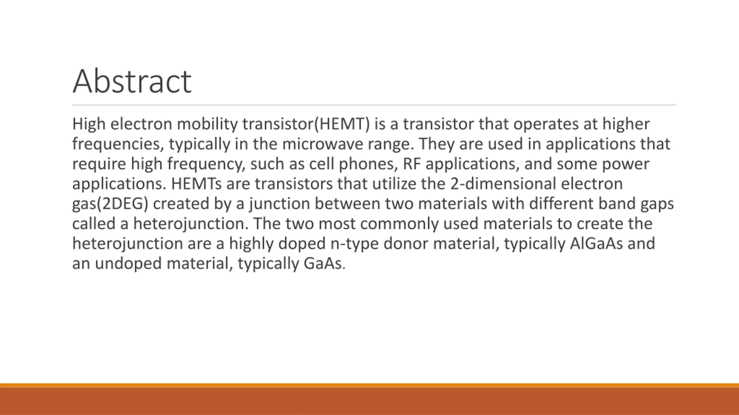 Abstract High electron mobility transistor(HEMT) is a transistor that operates at higher frequencies, typically in the microwave range. They are used in applications that require high frequency, such as cell phones, RF applications, and some power applications. HEMTs are transistors that utilize the 2-dimensional electron gas(2DEG) created by a junction between two materials with different band gaps called a heterojunction. The two most commonly used materials to create the heterojunction are a highly doped n-type donor material, typically AlGaAs and an undoped material, typically GaAs.