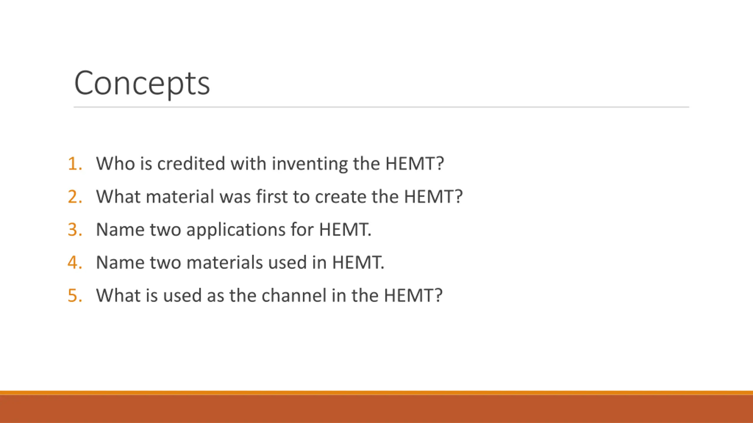 Concepts 1. Who is credited with inventing the HEMT? 2. What material was first to create the HEMT? 3. Name two applications for HEMT. 4. Name two materials used in HEMT. 5. What is used as the channel in the HEMT?