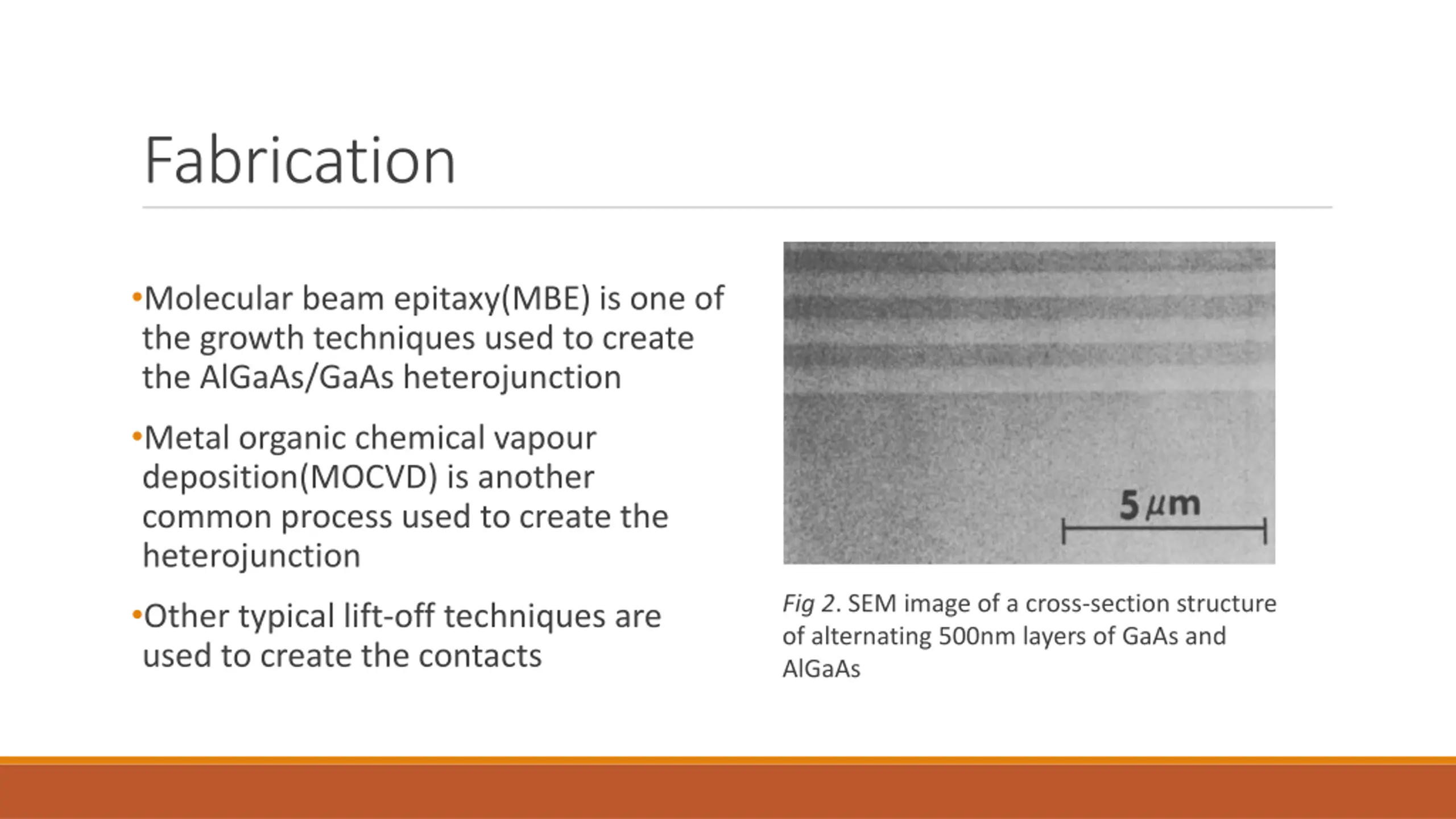 Fabrication Molecular beam epitaxy(MBE) is one of the growth techniques used to create the AlGaAs/GaAs heterojunction Metal organic chemical vapour deposition(MOCVD) is another common process used to create the heterojunction Fig 2. SEM image of a cross-section structure of alternating 500nm layers of GaAs and AlGaAs Other typical lift-off techniques are used to create the contacts