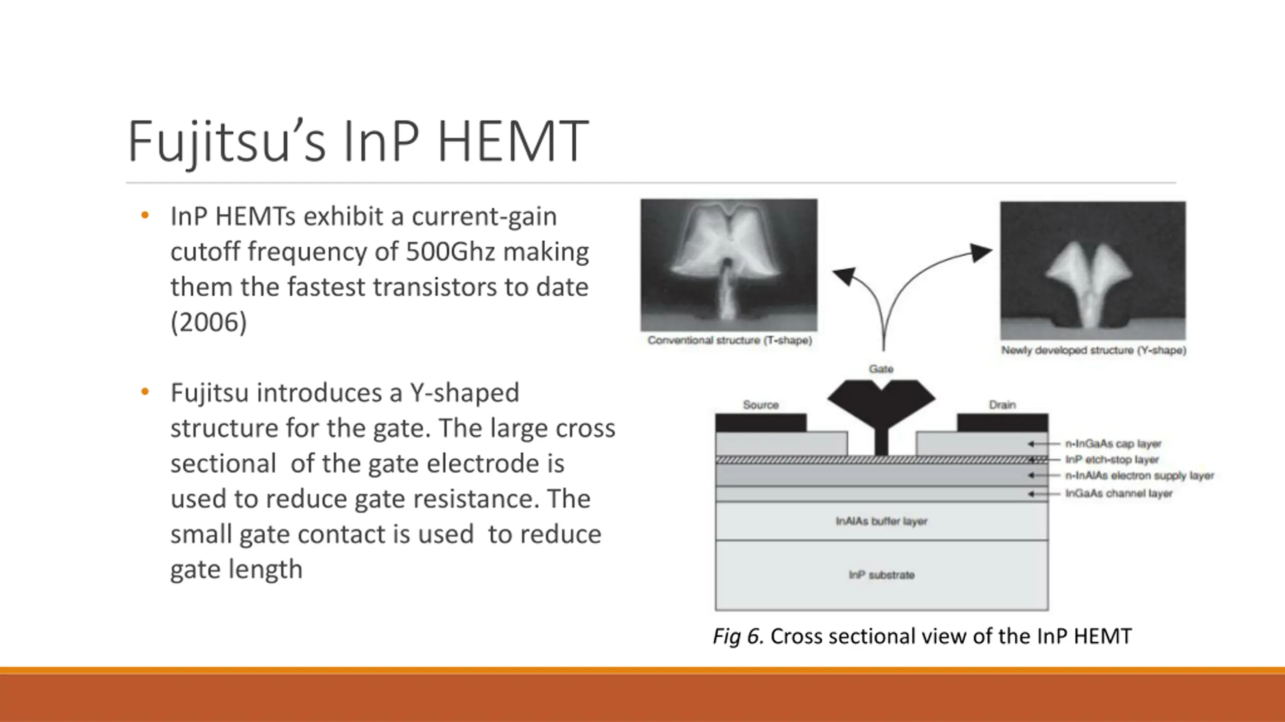 Fujitsus InP HEMT InP HEMTs exhibit a current-gain cutoff frequency of 500Ghz making them the fastest transistors to date (2006) Fujitsu introduces a Y-shaped structure for the gate. The large cross sectional of the gate electrode is used to reduce gate resistance. The small gate contact is used to reduce gate length Fig 6. Cross sectional view of the InP HEMT
