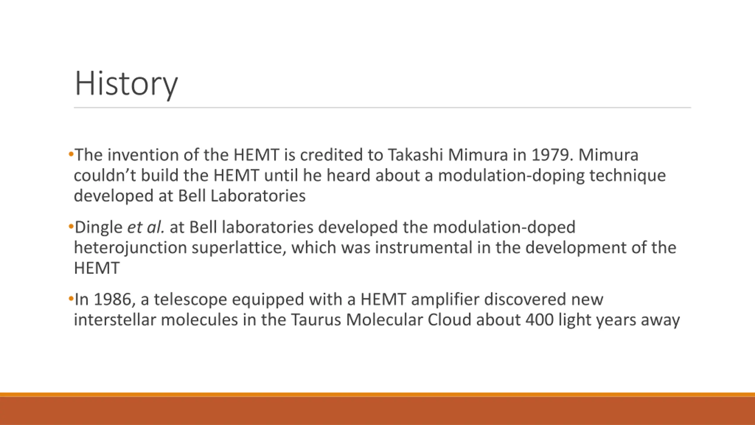 History The invention of the HEMT is credited to Takashi Mimura in 1979. Mimura couldn t build the HEMT until he heard about a modulation-doping technique developed at Bell Laboratories Dingle et al. at Bell laboratories developed the modulation-doped heterojunction superlattice, which was instrumental in the development of the HEMT In 1986, a telescope equipped with a HEMT amplifier discovered new interstellar molecules in the Taurus Molecular Cloud about 400 light years away