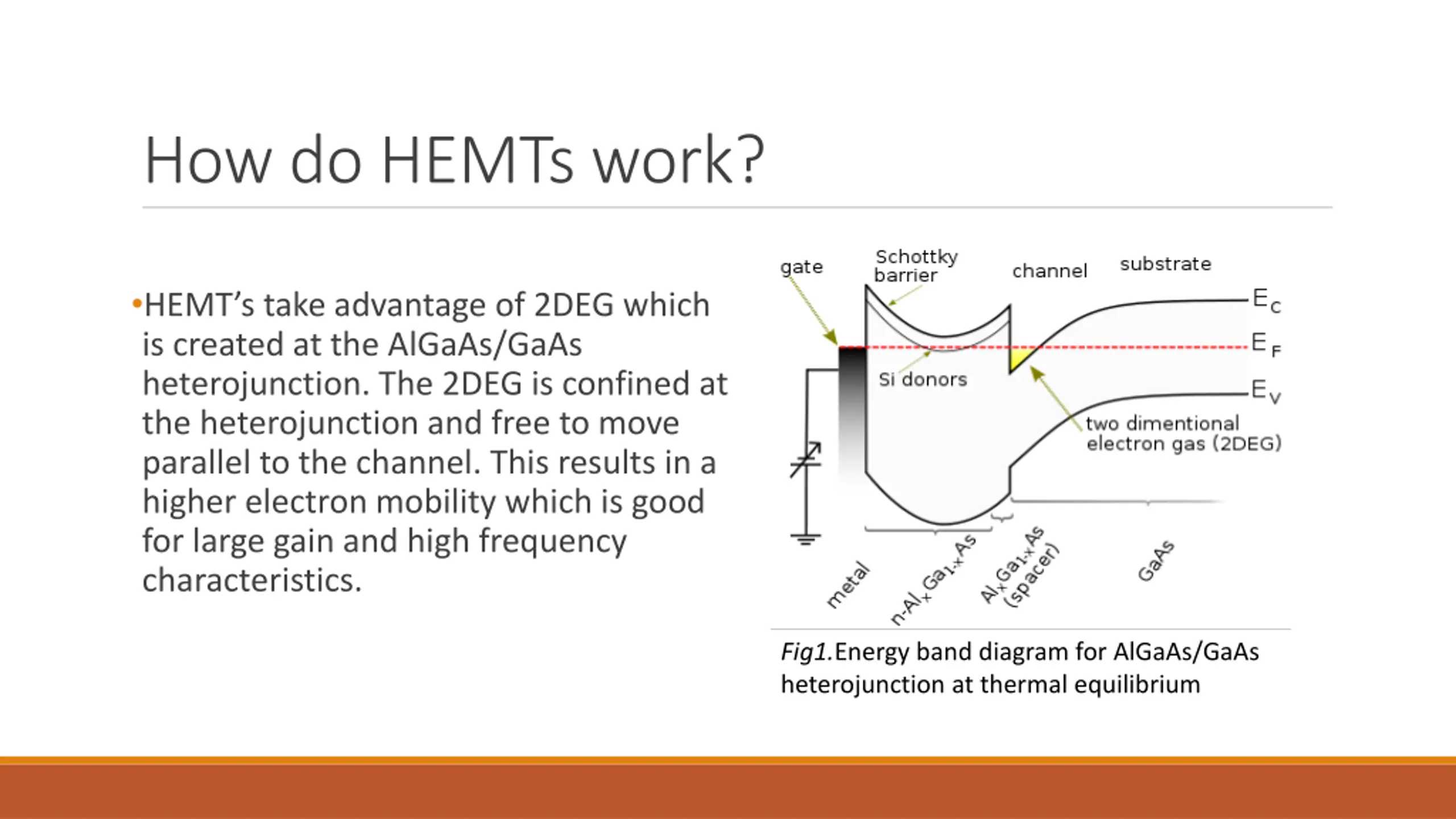 How do HEMTs work? HEMT s take advantage of 2DEG which is created at the AlGaAs/GaAs heterojunction. The 2DEG is confined at the heterojunction and free to move parallel to the channel. This results in a higher electron mobility which is good for large gain and high frequency characteristics. Fig1.Energy band diagram for AlGaAs/GaAs heterojunction at thermal equilibrium