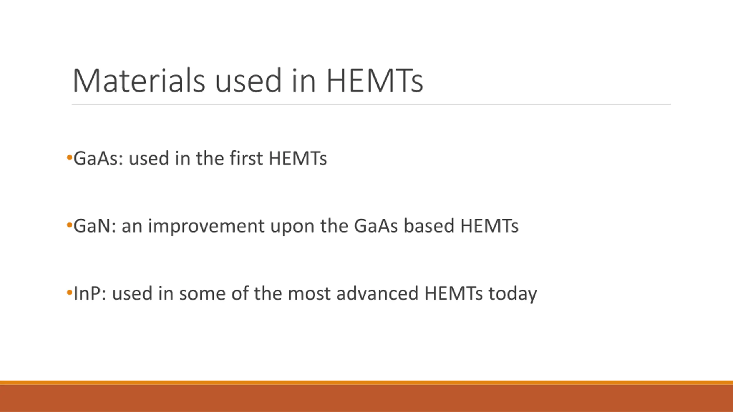 Materials used in HEMTs GaAs: used in the first HEMTs GaN: an improvement upon the GaAs based HEMTs InP: used in some of the most advanced HEMTs today
