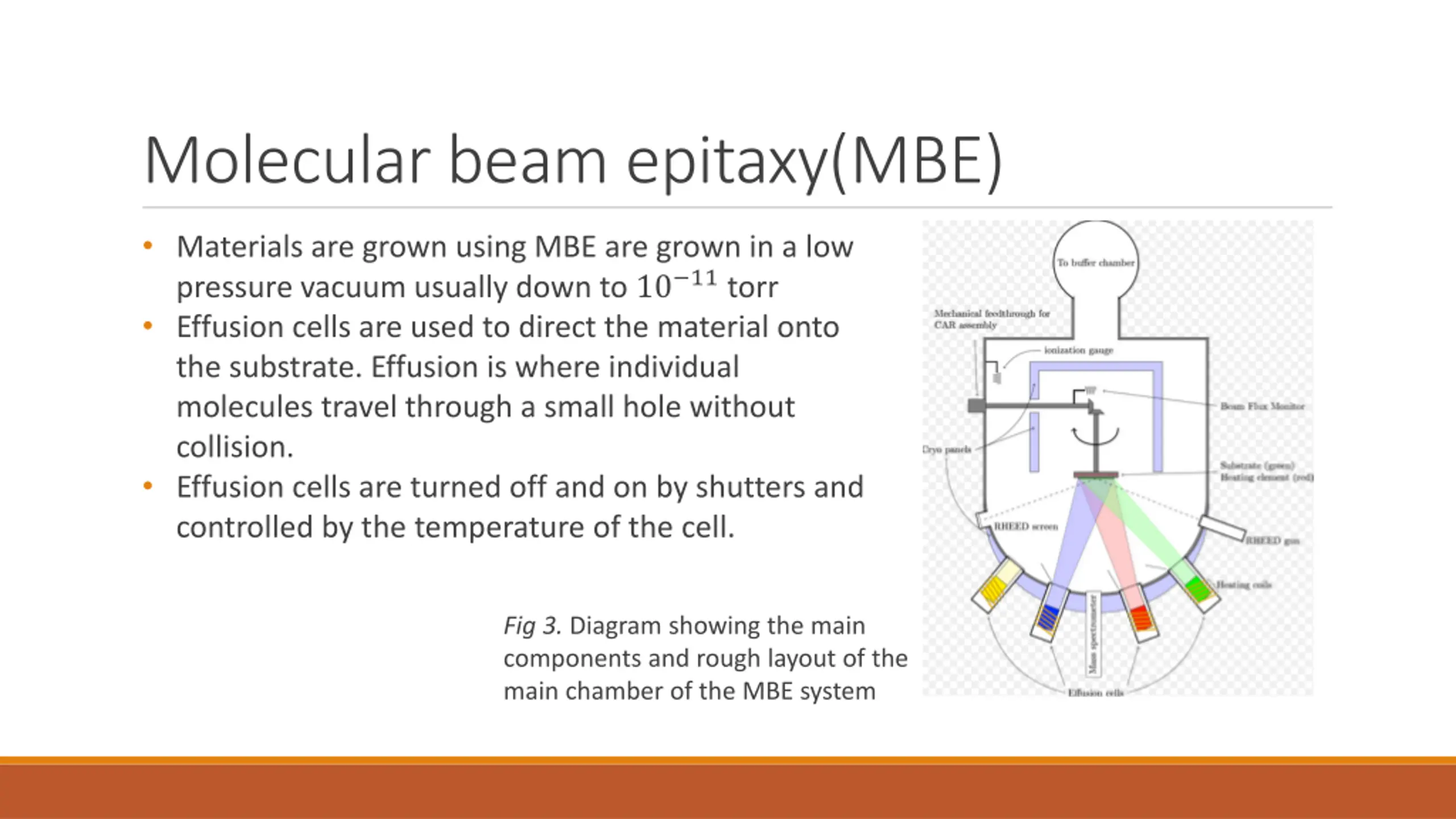 Molecular beam epitaxy(MBE) Materials are grown using MBE are grown in a low pressure vacuum usually down to 10 11 torr Effusion cells are used to direct the material onto the substrate. Effusion is where individual molecules travel through a small hole without collision. Effusion cells are turned off and on by shutters and controlled by the temperature of the cell. Fig 3. Diagram showing the main components and rough layout of the main chamber of the MBE system