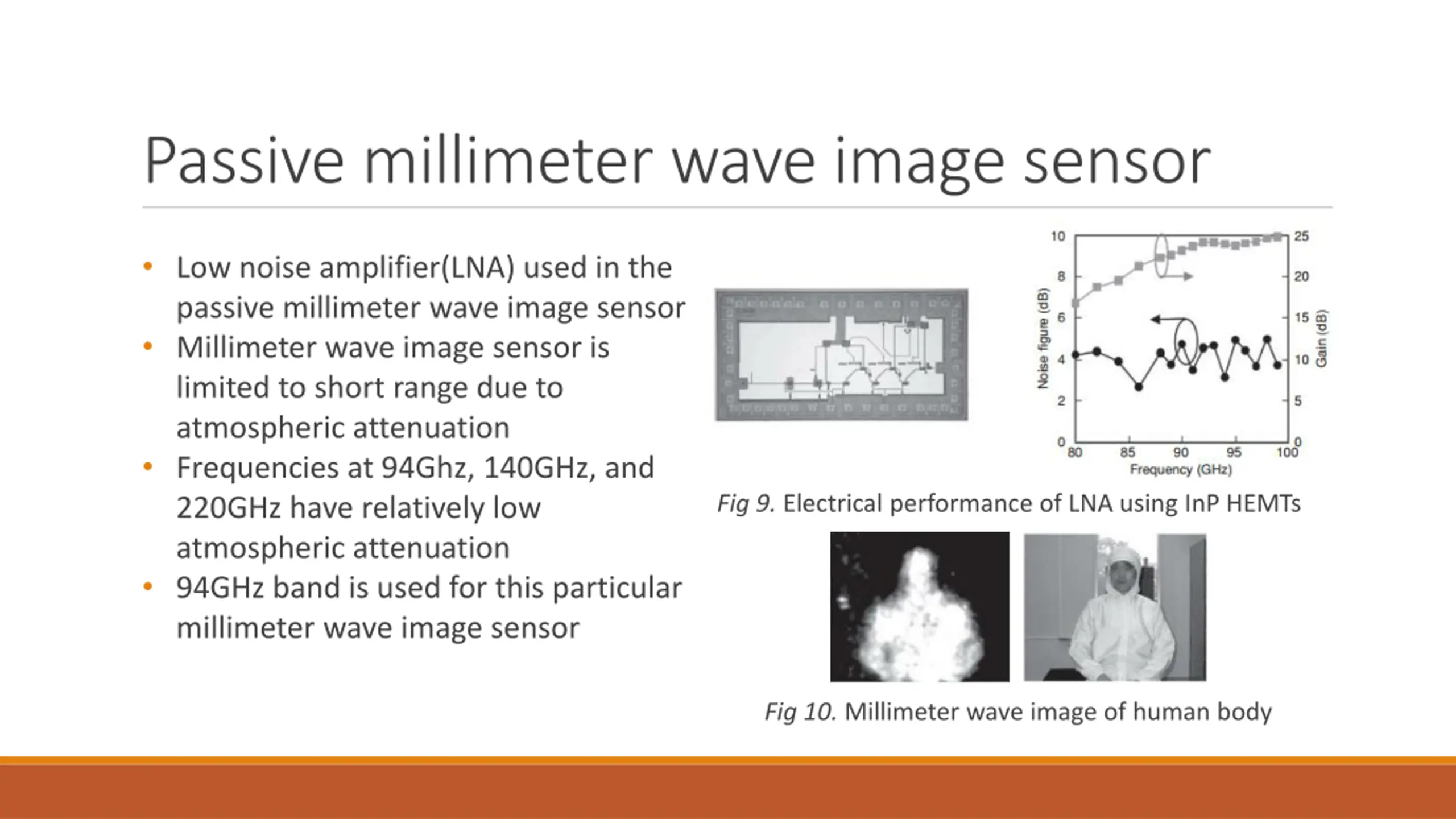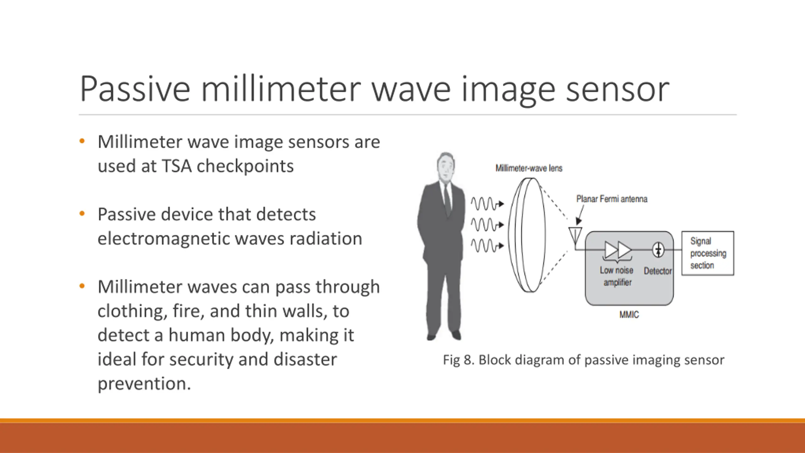 Passive millimeter wave image sensor Millimeter wave image sensors are used at TSA checkpoints Passive device that detects electromagnetic waves radiation Millimeter waves can pass through clothing, fire, and thin walls, to detect a human body, making it ideal for security and disaster prevention. Fig 8. Block diagram of passive imaging sensor