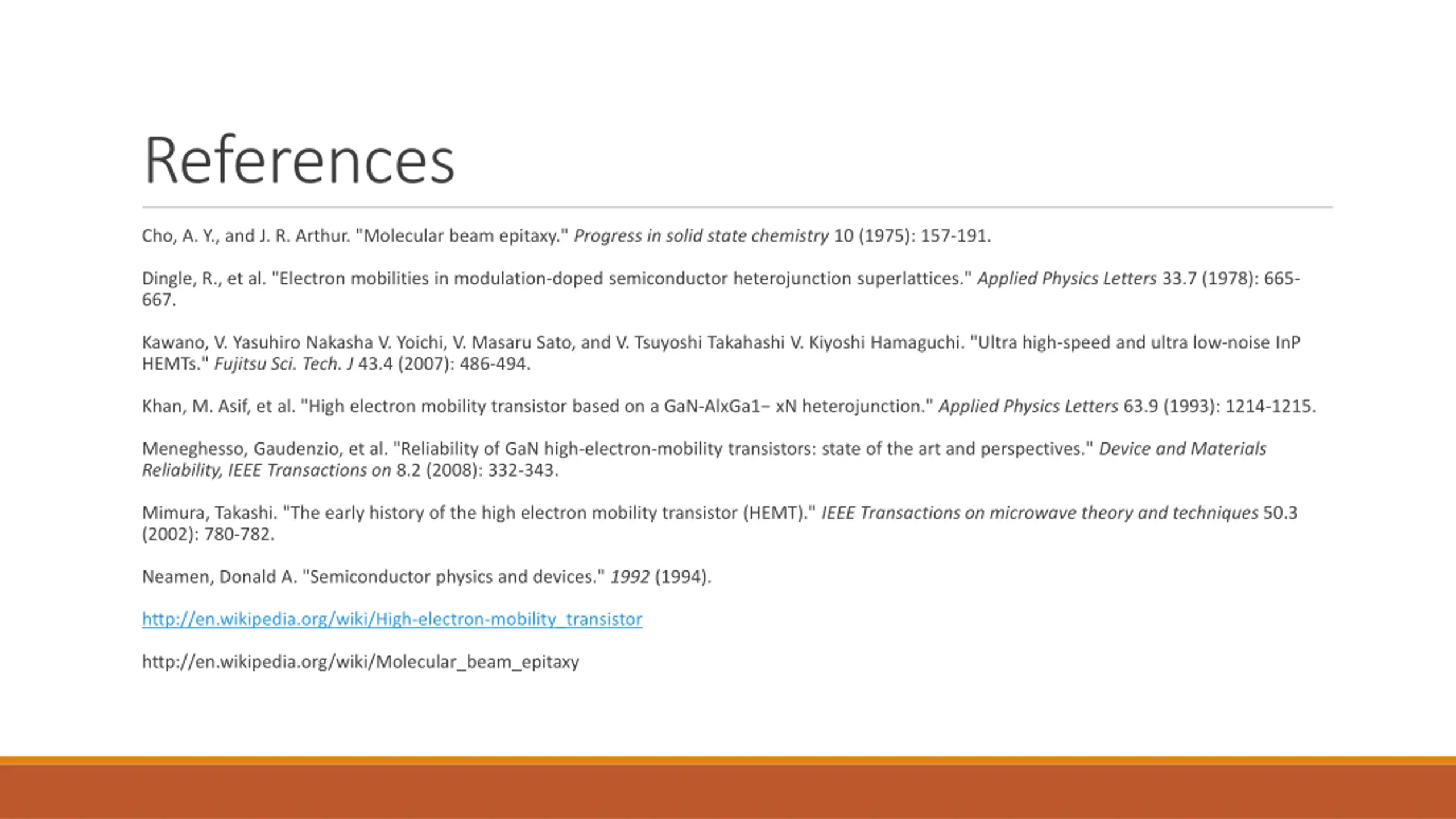References Cho, A. Y., and J. R. Arthur. "Molecular beam epitaxy." Progress in solid state chemistry 10 (1975): 157-191. Dingle, R., et al. "Electron mobilities in modulation doped semiconductor heterojunction superlattices." Applied Physics Letters 33.7 (1978): 665- 667. Kawano, V. Yasuhiro Nakasha V. Yoichi, V. Masaru Sato, and V. Tsuyoshi Takahashi V. Kiyoshi Hamaguchi. "Ultra high-speed and ultra low-noise InP HEMTs." Fujitsu Sci. Tech. J 43.4 (2007): 486-494. Khan, M. Asif, et al. "High electron mobility transistor based on a GaN AlxGa1 xN heterojunction." Applied Physics Letters 63.9 (1993): 1214-1215. Meneghesso, Gaudenzio, et al. "Reliability of GaN high-electron-mobility transistors: state of the art and perspectives." Device and Materials Reliability, IEEE Transactions on 8.2 (2008): 332-343. Mimura, Takashi. "The early history of the high electron mobility transistor (HEMT)." IEEE Transactions on microwave theory and techniques 50.3 (2002): 780-782. Neamen, Donald A. "Semiconductor physics and devices." 1992 (1994). http://en.wikipedia.org/wiki/High-electron-mobility_transistor http://en.wikipedia.org/wiki/Molecular_beam_epitaxy