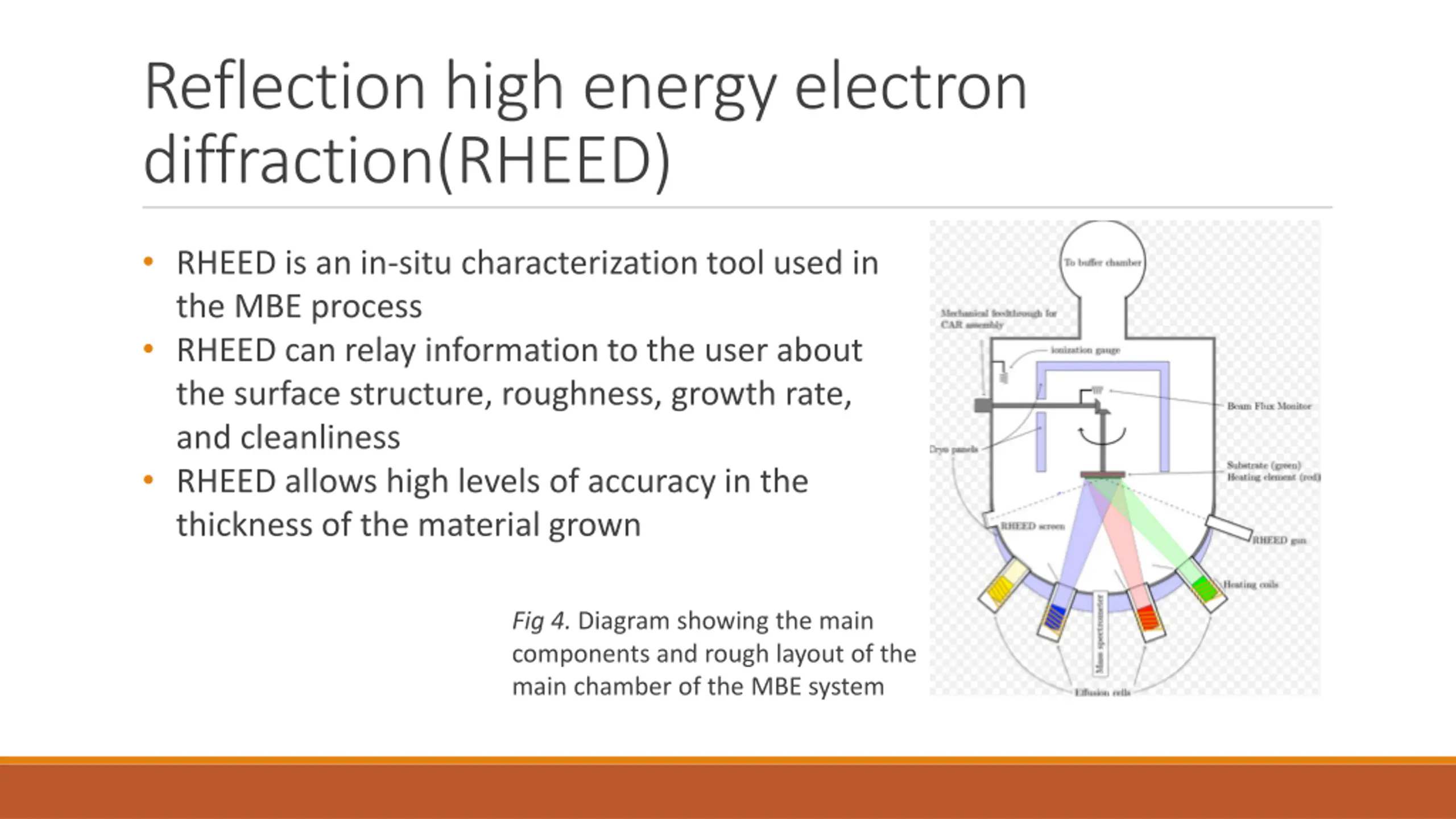 Reflection high energy electron diffraction(RHEED) RHEED is an in-situ characterization tool used in the MBE process RHEED can relay information to the user about the surface structure, roughness, growth rate, and cleanliness RHEED allows high levels of accuracy in the thickness of the material grown Fig 4. Diagram showing the main components and rough layout of the main chamber of the MBE system