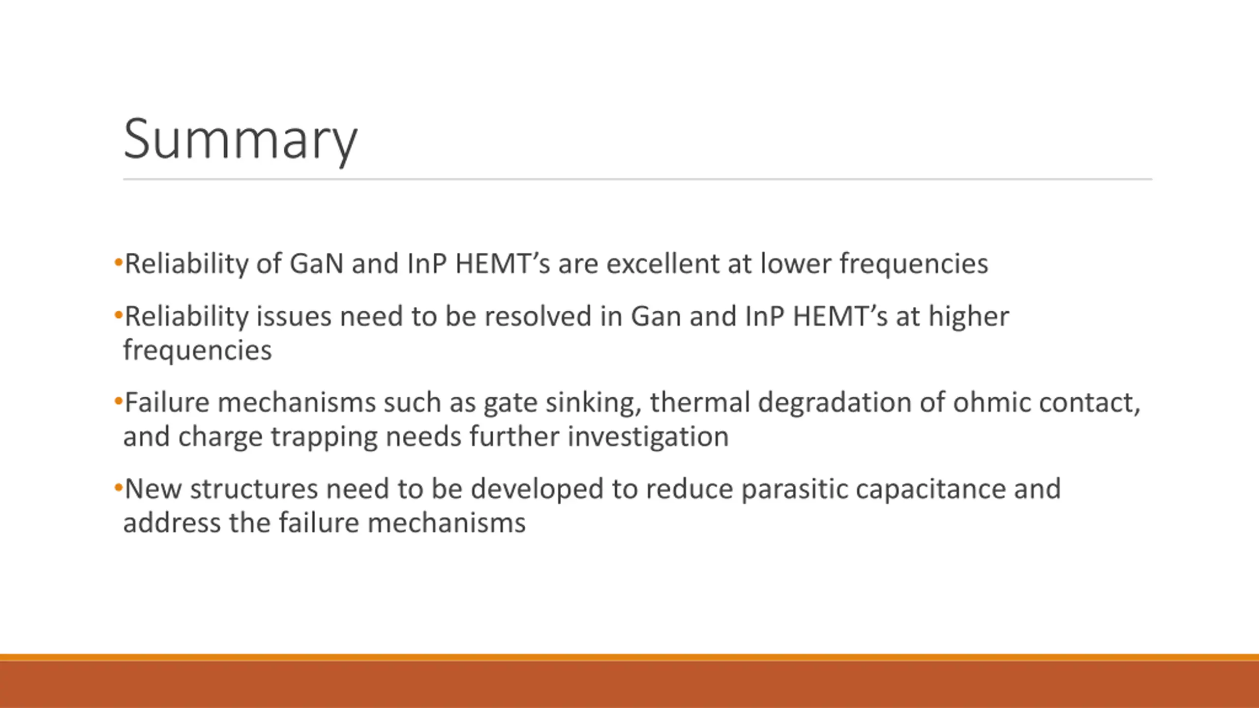 Summary Reliability of GaN and InP HEMT s are excellent at lower frequencies Reliability issues need to be resolved in Gan and InP HEMT s at higher frequencies Failure mechanisms such as gate sinking, thermal degradation of ohmic contact, and charge trapping needs further investigation New structures need to be developed to reduce parasitic capacitance and address the failure mechanisms