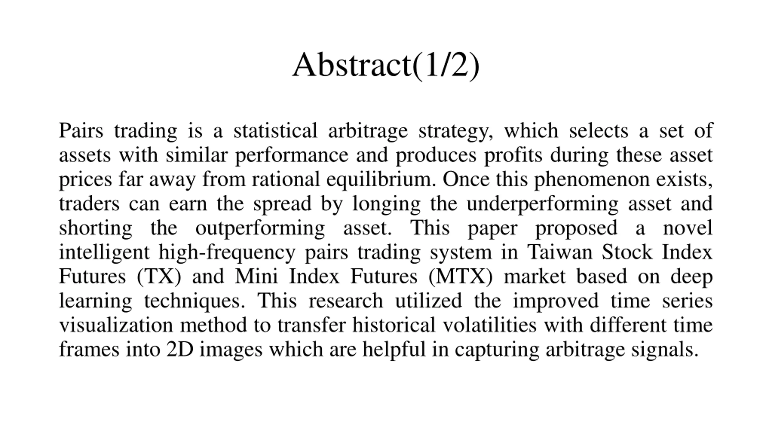 Abstract(1/2) Pairs trading is a statistical arbitrage strategy, which selects a set of assets with similar performance and produces profits during these asset prices far away from rational equilibrium. Once this phenomenon exists, traders can earn the spread by longing the underperforming asset and shorting the outperforming asset. This paper proposed a novel intelligent high-frequency pairs trading system in Taiwan Stock Index Futures (TX) and Mini Index Futures (MTX) market based on deep learning techniques. This research utilized the improved time series visualization method to transfer historical volatilities with different time frames into 2D images which are helpful in capturing arbitrage signals.