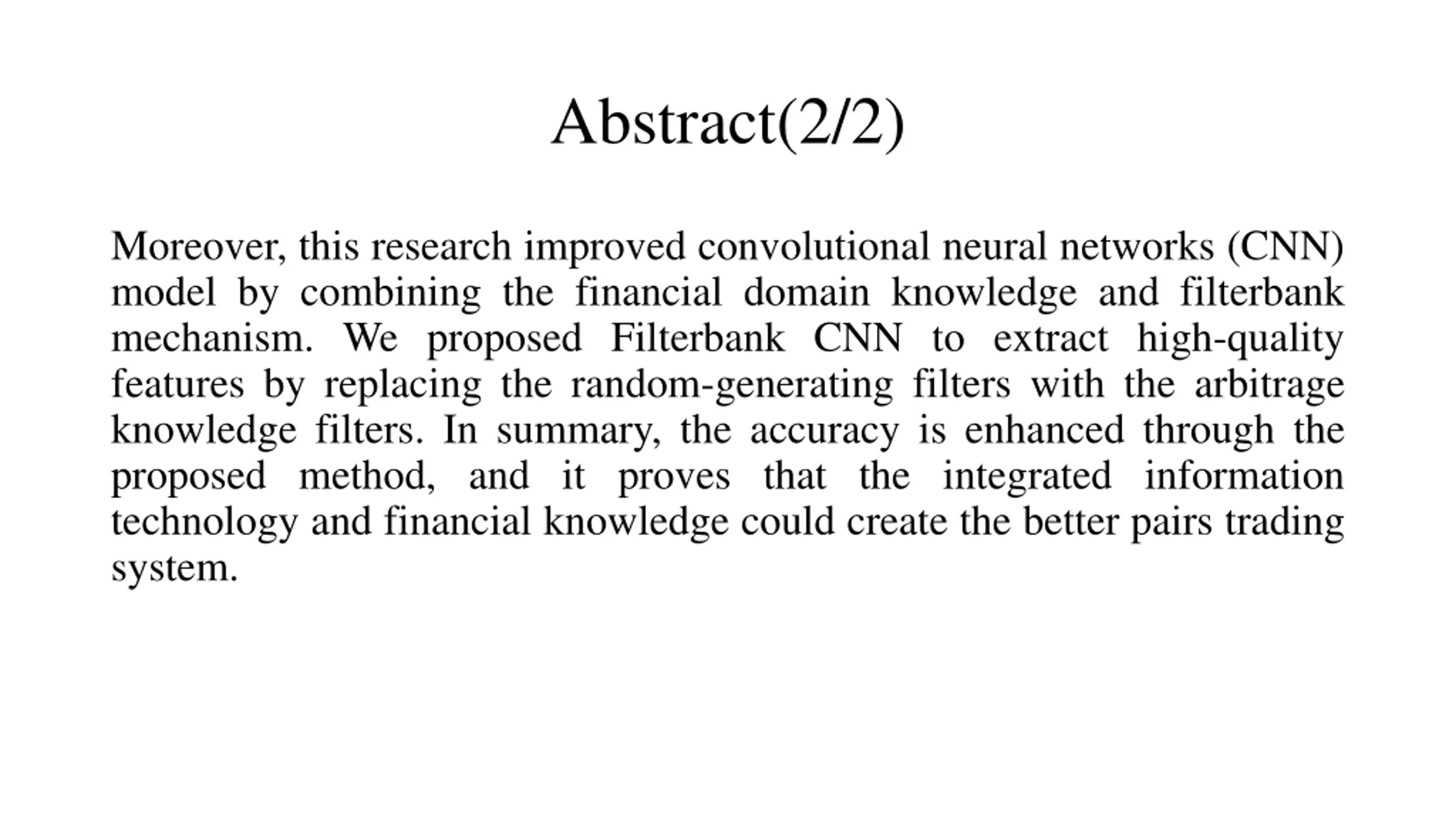 Abstract(2/2) Moreover, this research improved convolutional neural networks (CNN) model by combining the financial domain knowledge and filterbank mechanism. We proposed Filterbank CNN to extract high-quality features by replacing the random-generating filters with the arbitrage knowledge filters. In summary, the accuracy is enhanced through the proposed method, and it proves that the integrated information technology and financial knowledge could create the better pairs trading system.