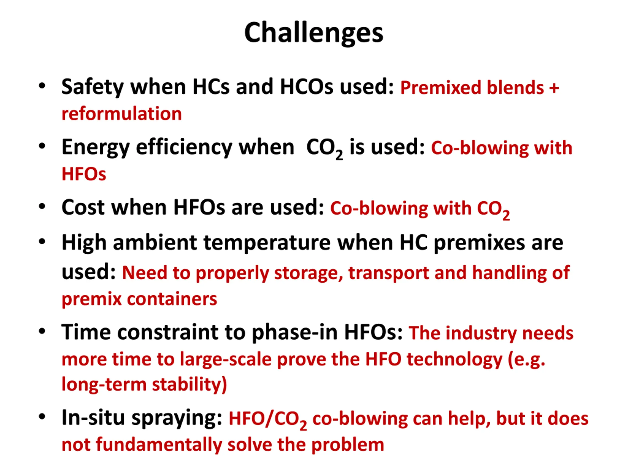Challenges Safety when HCs and HCOs used: Premixed blends + reformulation Energy efficiency when CO2 is used: Co-blowing with HFOs Cost when HFOs are used: Co-blowing with CO2 High ambient temperature when HC premixes are used: Need to properly storage, transport and handling of premix containers Time constraint to phase-in HFOs: The industry needs more time to large-scale prove the HFO technology (e.g. long-term stability) In-situ spraying: HFO/CO2 co-blowing can help, but it does not fundamentally solve the problem