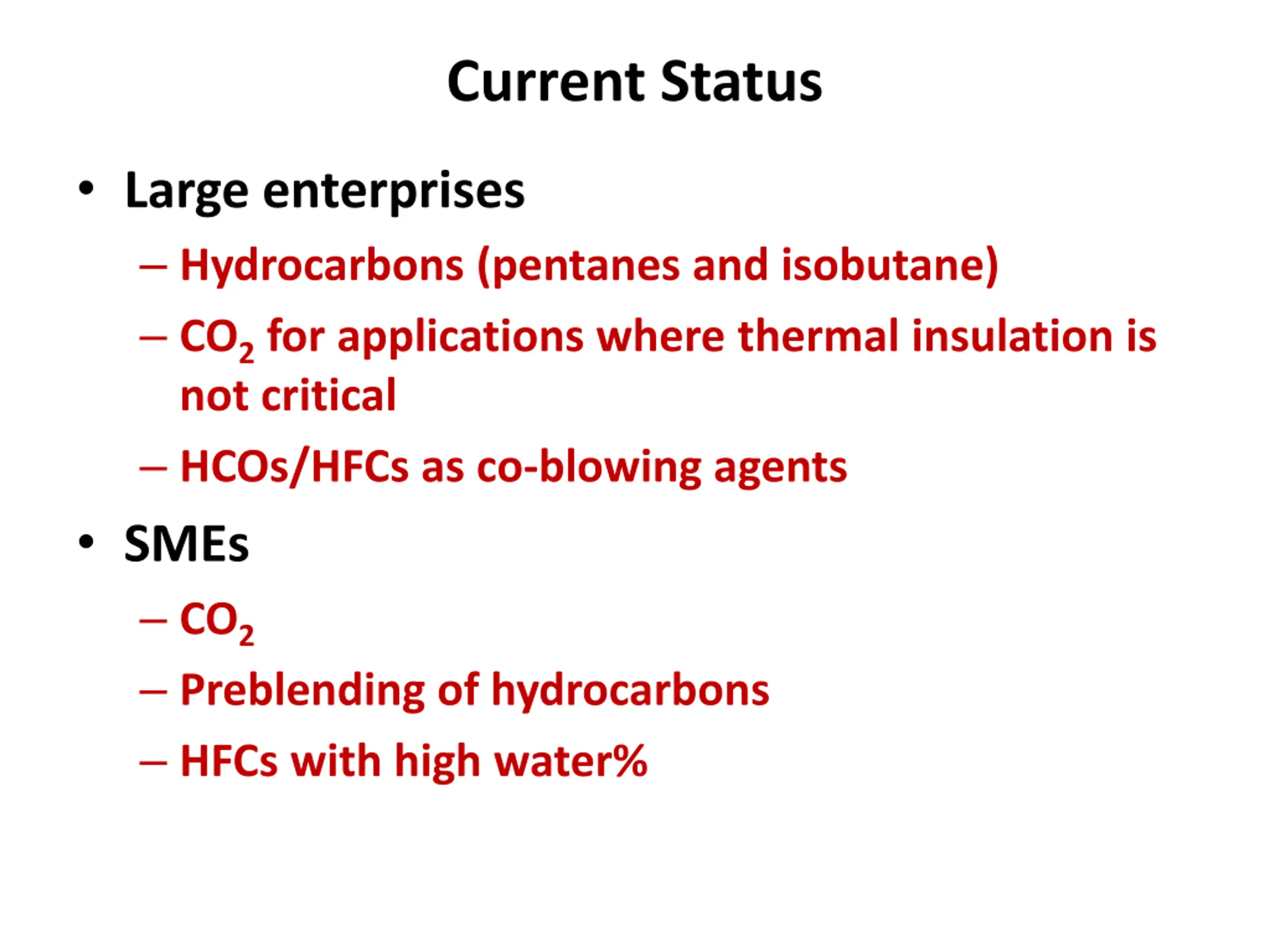 Current Status Large enterprises Hydrocarbons (pentanes and isobutane) CO2 for applications where thermal insulation is not critical HCOs/HFCs as co-blowing agents SMEs CO2 Preblending of hydrocarbons HFCs with high water%