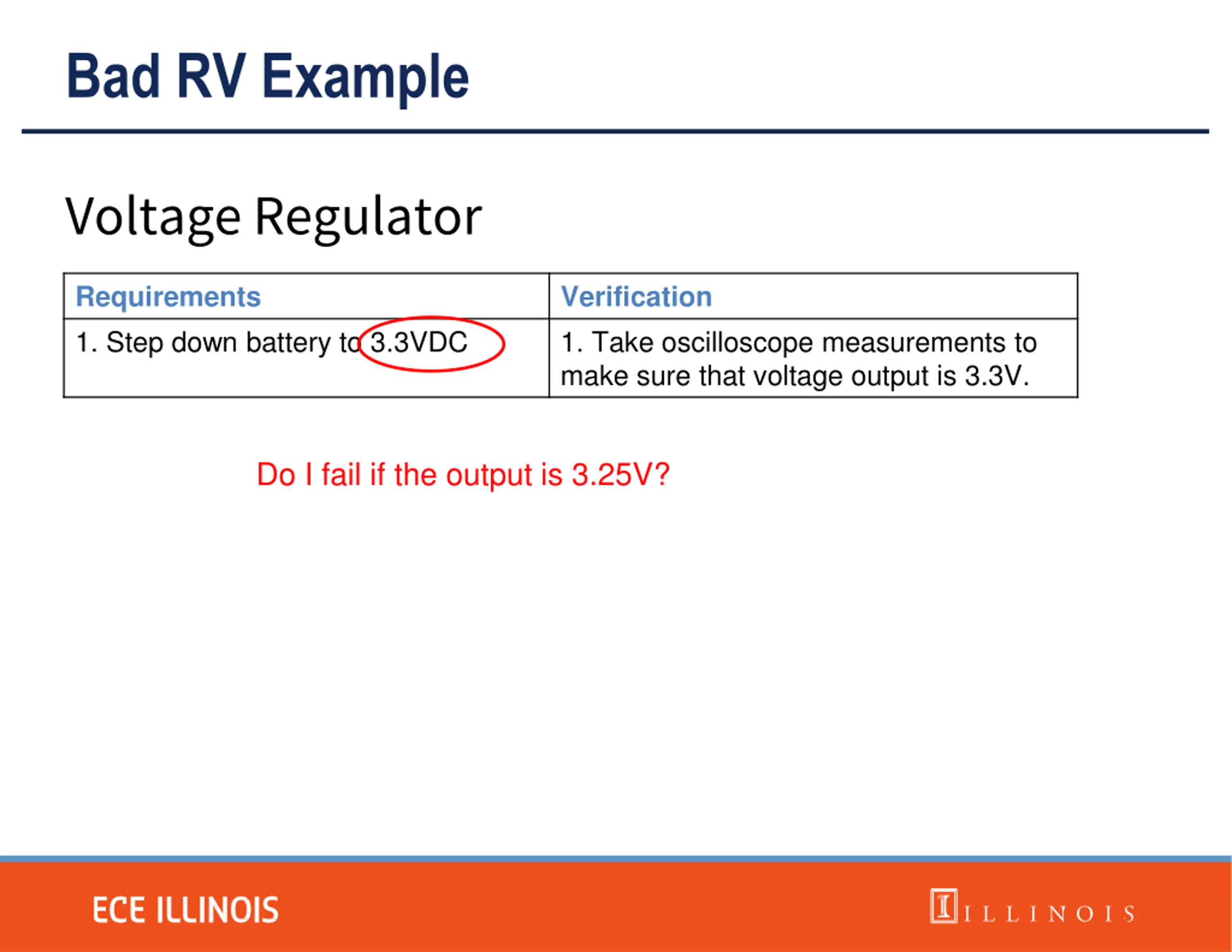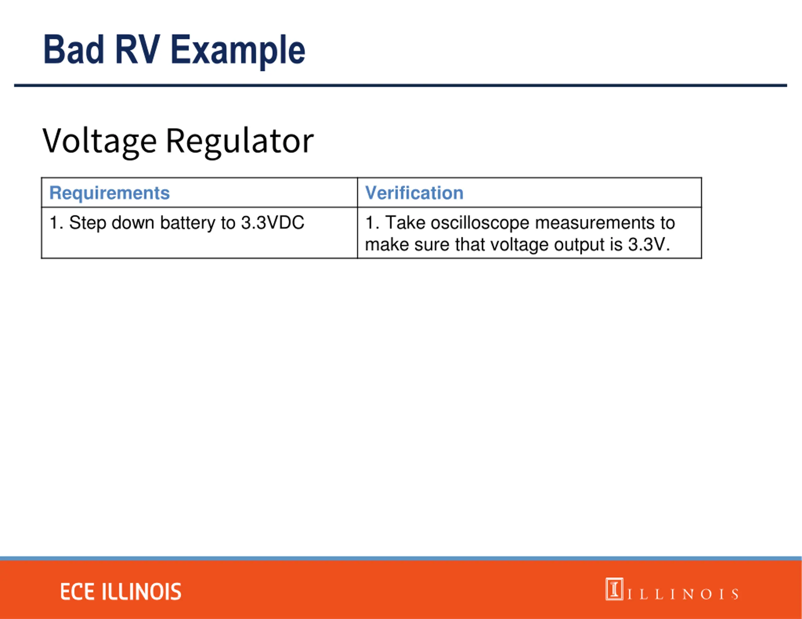 Bad RV Example Voltage Regulator Requirements 1. Step down battery to 3.3VDC Verification 1. Take oscilloscope measurements to make sure that voltage output is 3.3V. Do I fail if the output is 3.25V?