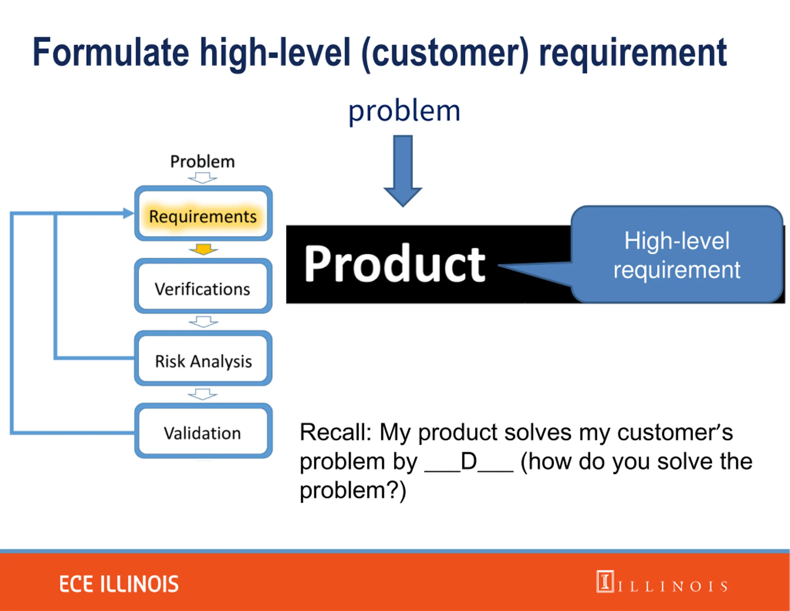 Formulate high-level (customer) requirement problem High-level requirement Recall: My product solves my customer s problem by ___D___ (how do you solve the problem?)