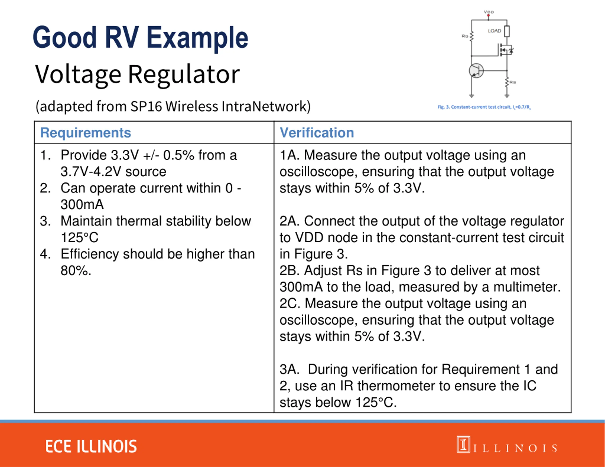 Good RV Example Voltage Regulator (adaptedfrom SP16WirelessIntraNetwork) Requirements 1. Provide 3.3V +/- 0.5% from a 3.7V-4.2V source 2. Can operate current within 0-300mA 3. Maintain thermal stability below 125 C 4. Efficiency should be higher than 80%. Verification 1A. Measure the output voltage using an oscilloscope, ensuring that the output voltage stays within 5% of 3.3V. 2A. Connect the output of the voltage regulator to VDD node in the constant-current test circuit in Figure 3. 2B. Adjust Rs in Figure 3 to deliver at most 300mA to the load, measured by a multimeter. 2C. Measure the output voltage using an oscilloscope, ensuring that the output voltage stays within 5% of 3.3V. Equipment 3A. During verification for Requirement 1 and 2, use an IR thermometer to ensure the IC stays below 125 C.