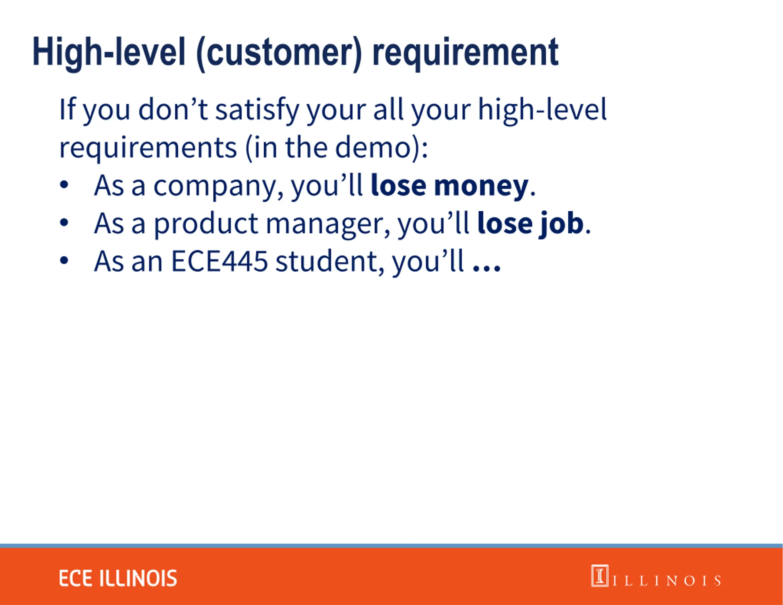 High-level (customer) requirement If you don t satisfy your all your high-level requirements (in the demo): As a company, you ll lose money. As a product manager, you ll lose job. As an ECE445 student, you ll