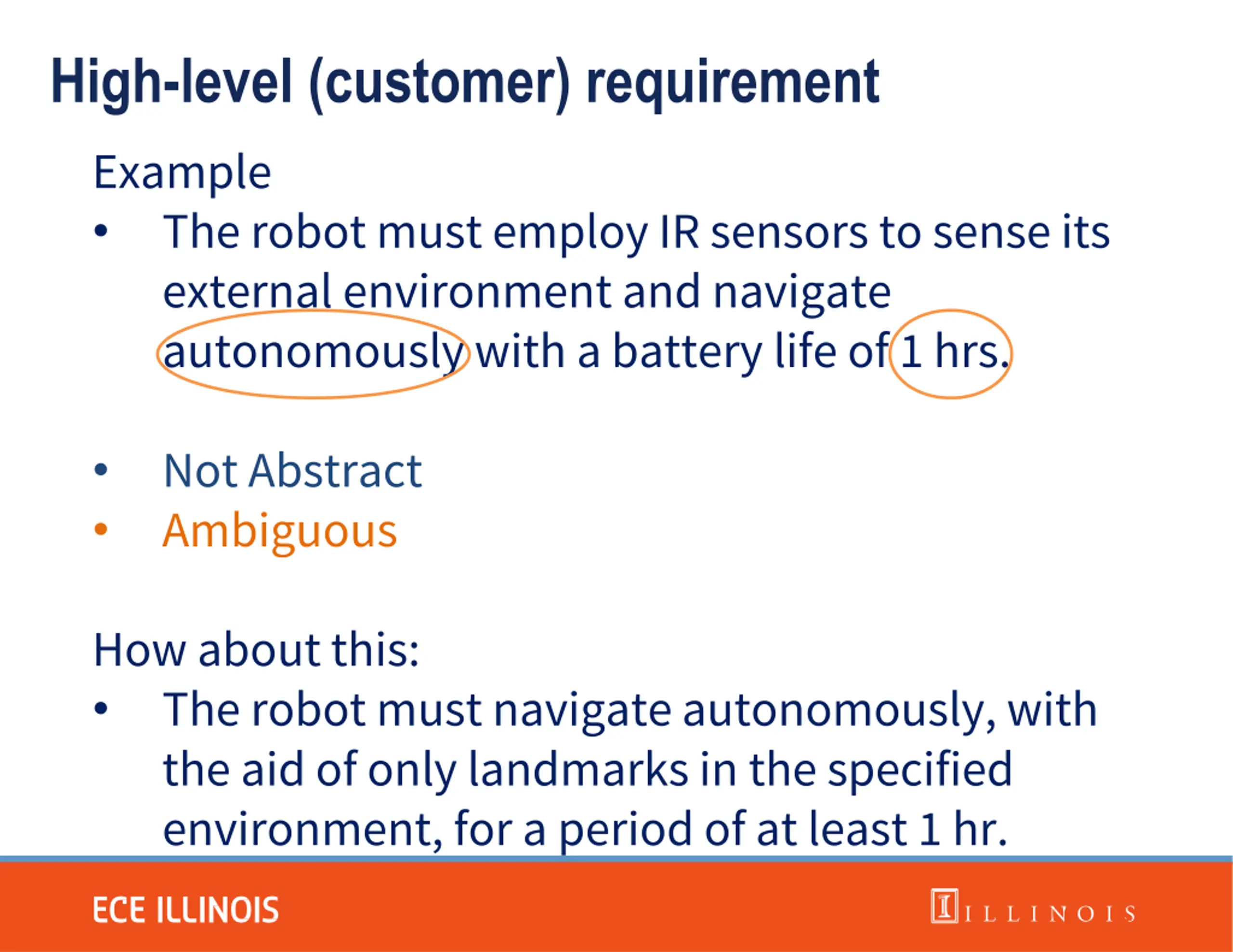 High-level (customer) requirement Example The robot must employ IR sensors to sense its external environment and navigate autonomously with a battery life of 1 hrs. Not Abstract Ambiguous How about this: The robot must navigate autonomously, with the aid of only landmarks in the specified environment, for a period of at least 1 hr.
