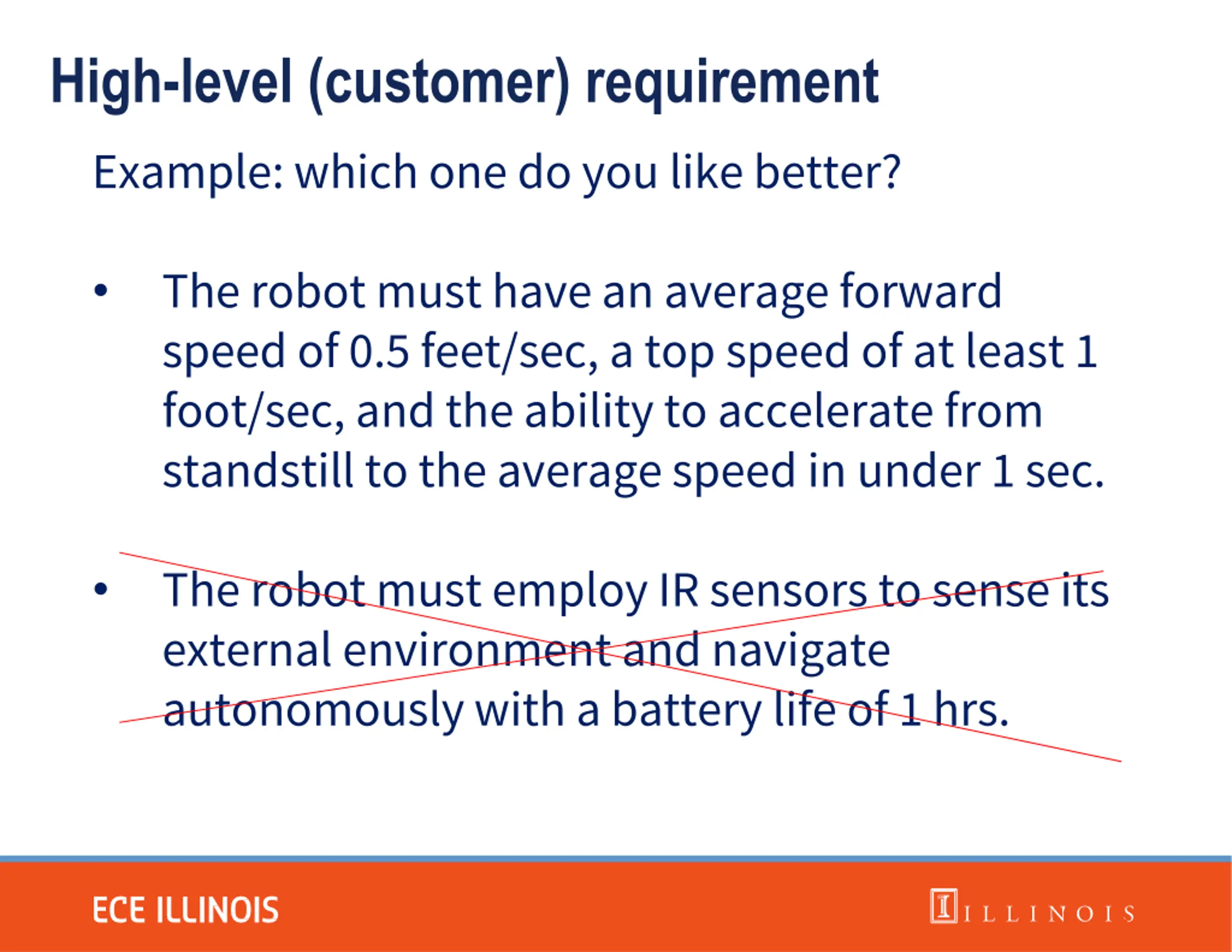 High-level (customer) requirement Example: which one do you like better? The robot must have an average forward speed of 0.5 feet/sec, a top speed of at least 1 foot/sec, and the ability to accelerate from standstill to the average speed in under 1 sec. The robot must employ IR sensors to sense its external environment and navigate autonomously with a battery life of 1 hrs.