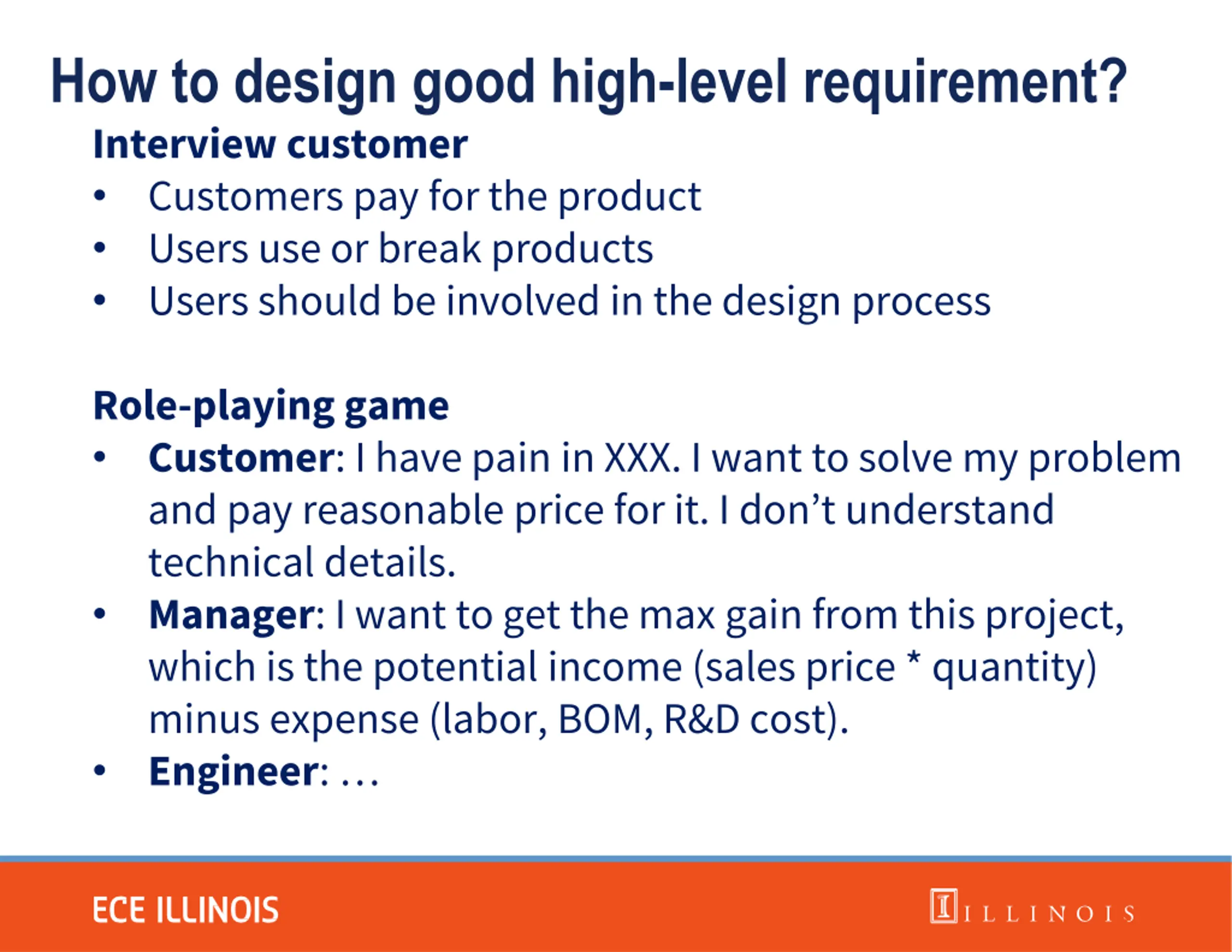 How to design good high-level requirement? Interview customer Customers pay for the product Users use or break products Users should be involved in the design process Role-playing game Customer: I have pain in XXX. I want to solve my problem and pay reasonable price for it. I don t understand technical details. Manager: I want to get the max gain from this project, which is the potential income (sales price * quantity) minus expense (labor, BOM, R&D cost). Engineer: