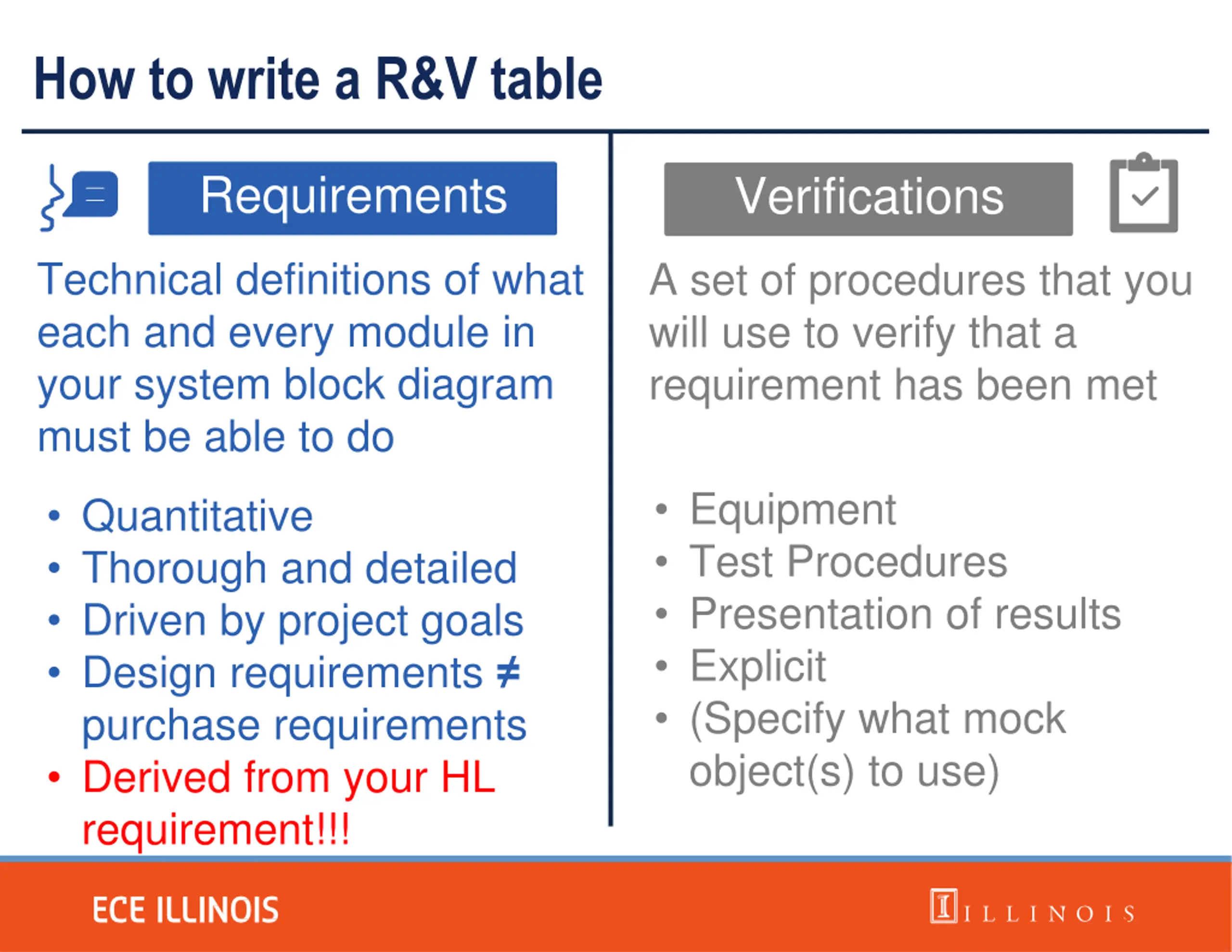 What is a R&V table and why we care A two-column table with requirements on the left, and verification on the right What A checklist for both modular goals and modular debugging If all requirements have been verified by your verification for every module, you should have a fully functioning project. ... and of course, to pass the class : ) Why For Senior Design purpose you want a R&V table for each block in your block diagram
