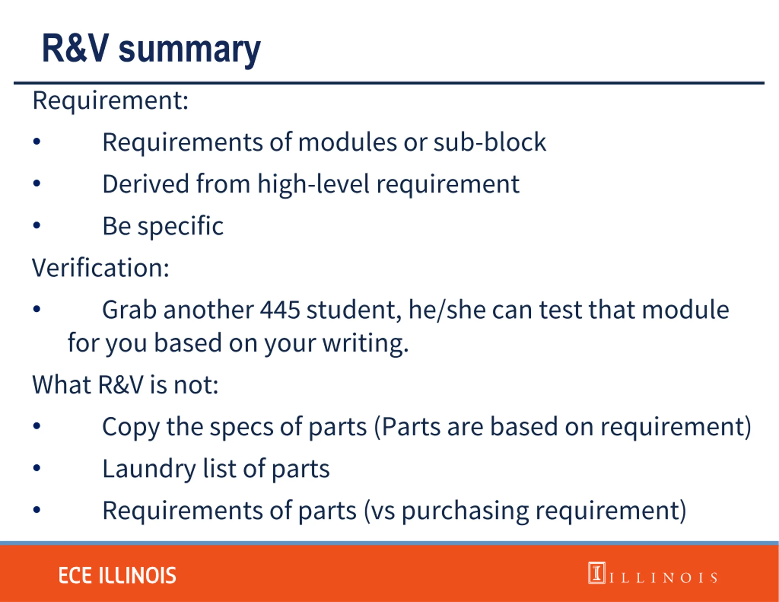 R&V summary Requirement: Requirements of modules or sub-block Derived from high-level requirement Be specific Verification: Grab another 445 student, he/she can test that module for you based on your writing. What R&V is not: Copy the specs of parts (Parts are based on requirement) Laundry list of parts Requirements of parts (vs purchasing requirement)