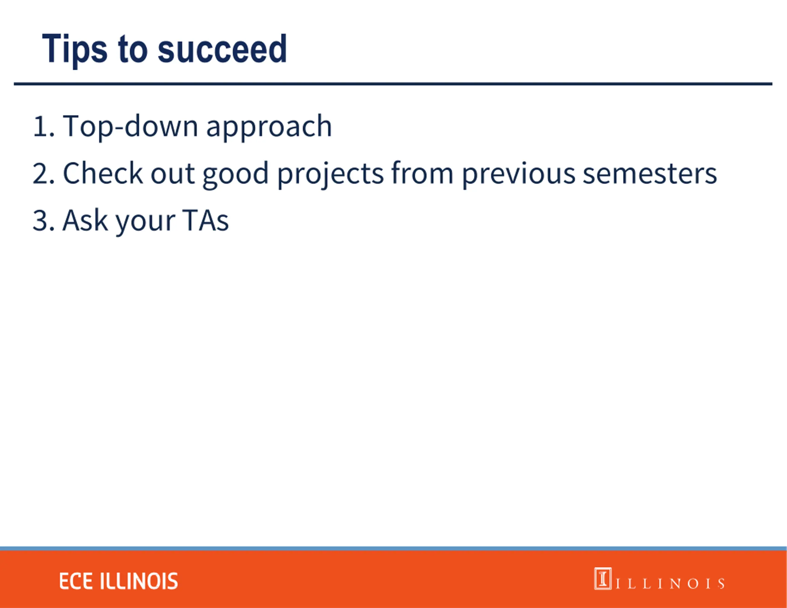 Tips to succeed 1. Top-down approach 2. Check out good projects from previous semesters 3. Ask your TAs