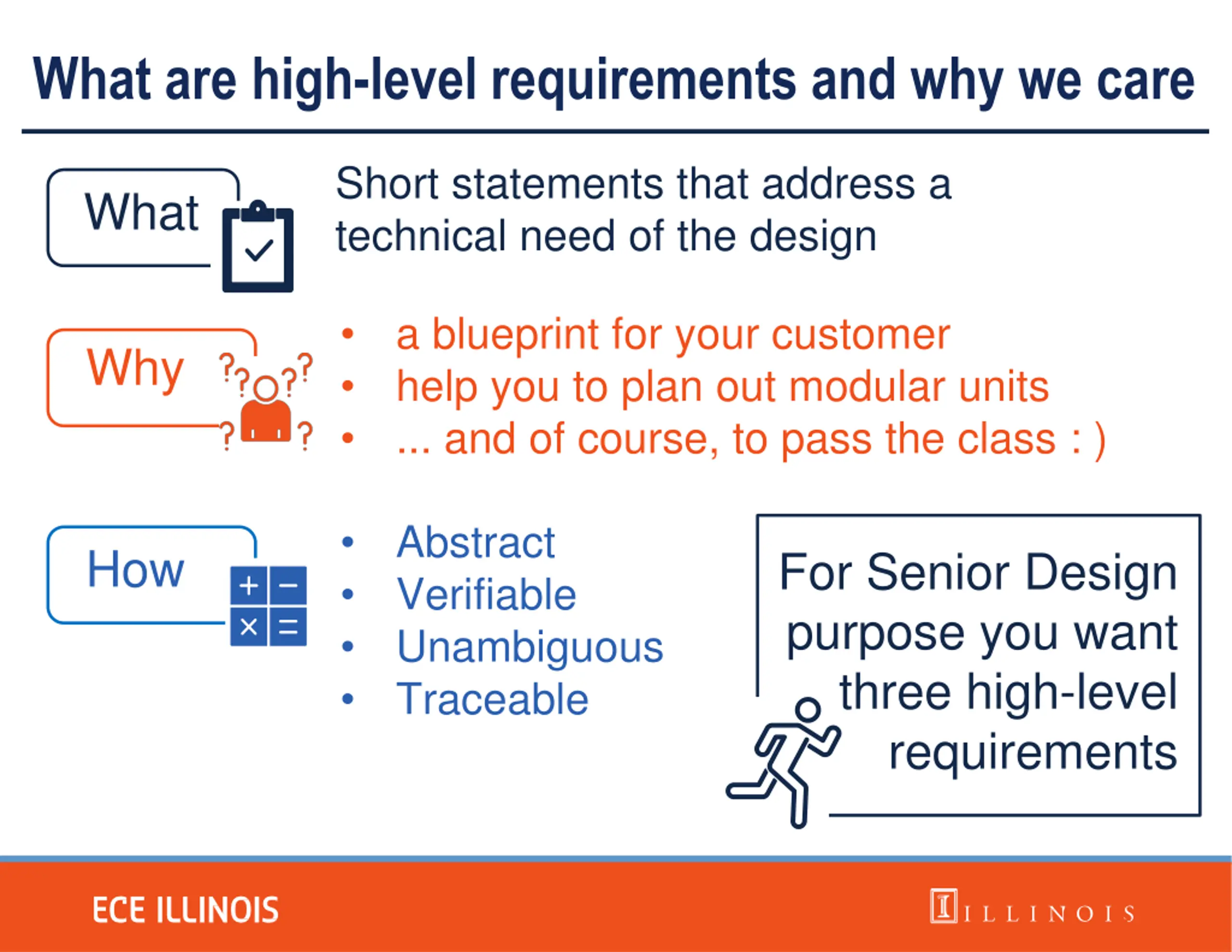 What are high-level requirements and why we care Short statements that address a technical need of the design What a blueprint for your customer help you to plan out modular units ... and of course, to pass the class : ) Why Abstract Verifiable Unambiguous Traceable How For Senior Design purpose you want three high-level requirements