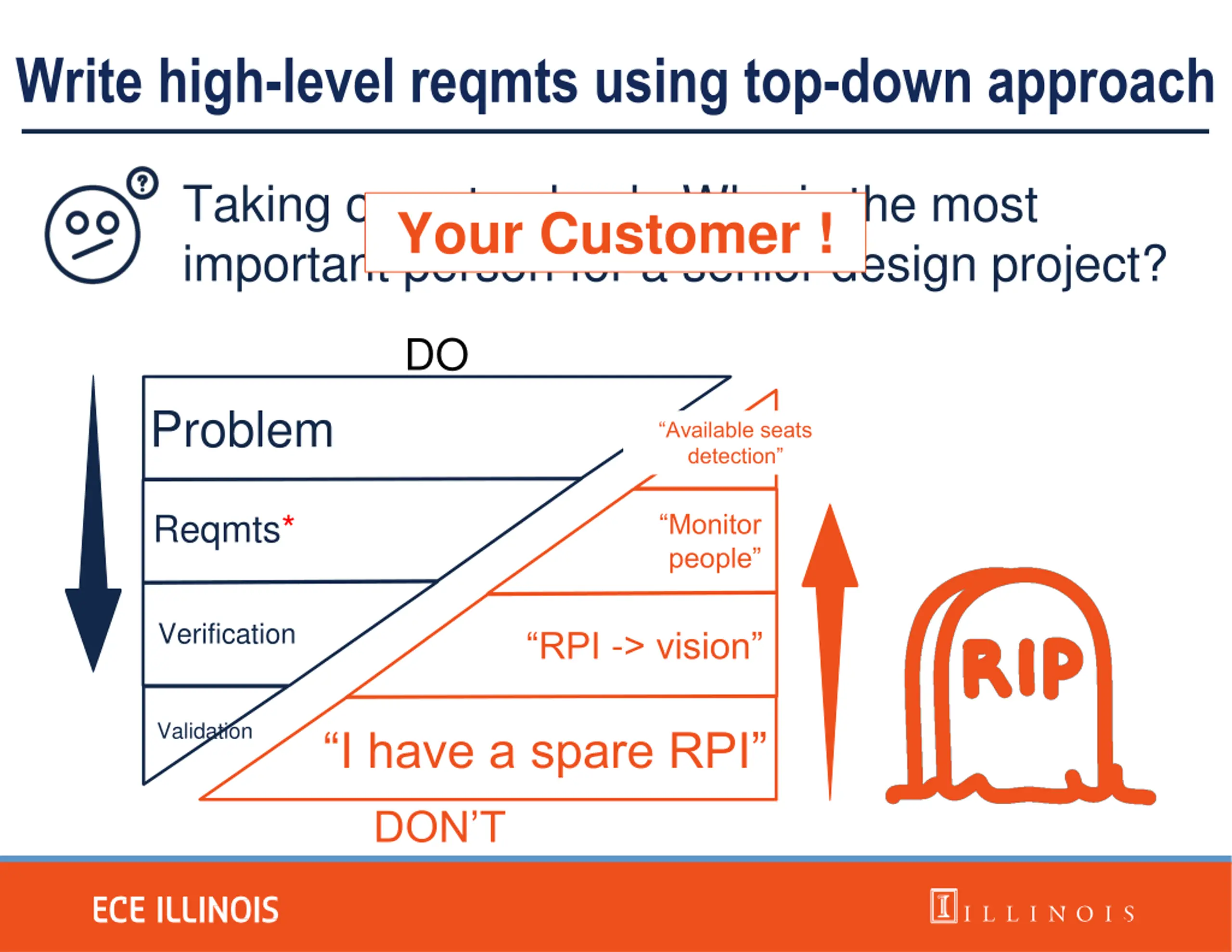 Write high-level reqmts using top-down approach Taking one step back: Who is the most important person for a senior design project? Your Customer ! DO Problem Available seats detection Reqmts* Monitor people Verification RPI -> vision Validation I have a spare RPI DON T