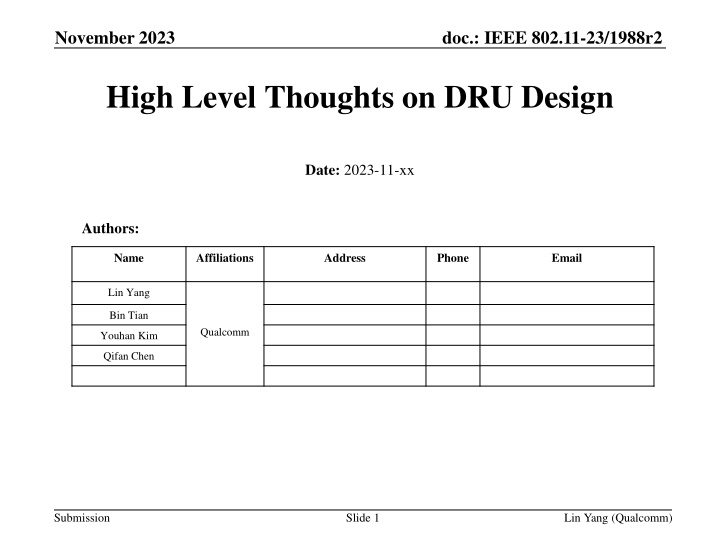 doc.: IEEE 802.11-23/1988r2 November 2023 High Level Thoughts on DRU Design Date: 2023-11-xx Authors: Name Affiliations Address Phone Email Lin Yang Bin Tian Qualcomm Youhan Kim Qifan Chen Submission Slide 1 Lin Yang (Qualcomm)