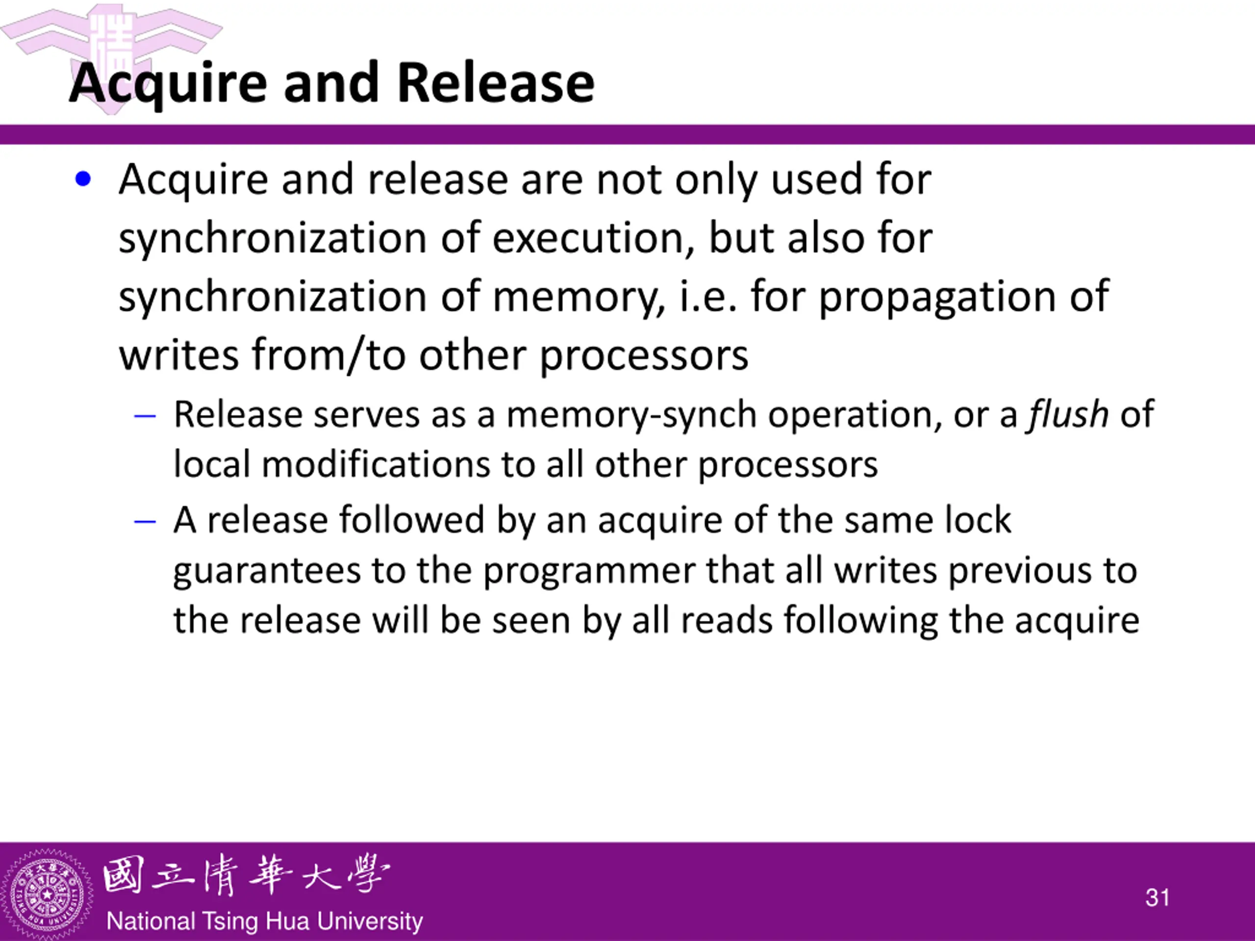 Acquire and Release Acquire and release are not only used for synchronization of execution, but also for synchronization of memory, i.e. for propagation of writes from/to other processors Release serves as a memory-synch operation, or a flush of local modifications to all other processors A release followed by an acquire of the same lock guarantees to the programmer that all writes previous to the release will be seen by all reads following the acquire 31 National Tsing Hua University