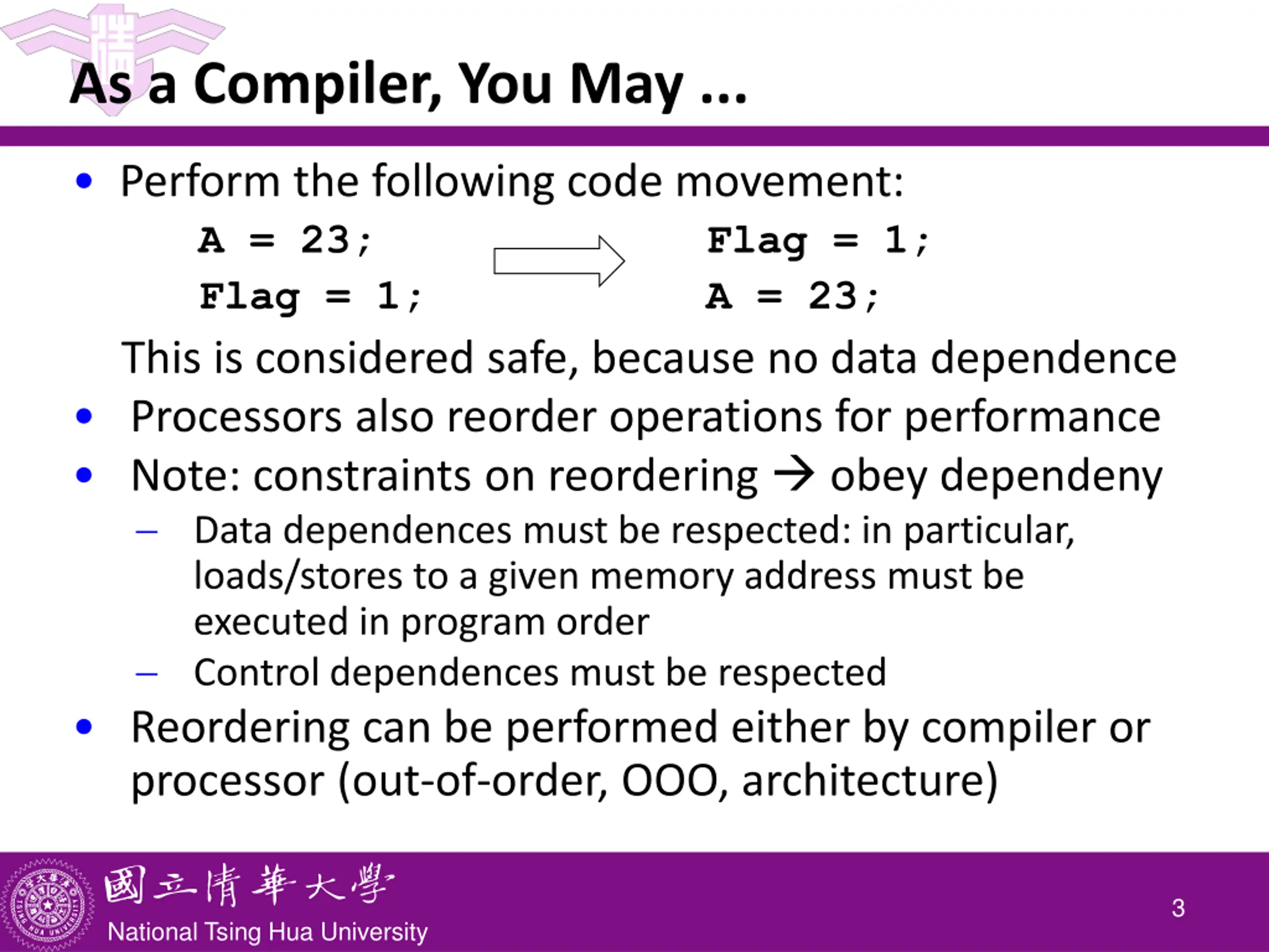 As a Compiler, You May ... Perform the following code movement: A = 23; Flag = 1; This is considered safe, because no data dependence Processors also reorder operations for performance Note: constraints on reordering obey dependeny Data dependences must be respected: in particular, loads/stores to a given memory address must be executed in program order Control dependences must be respected Reordering can be performed either by compiler or processor (out-of-order, OOO, architecture) Flag = 1; A = 23; 3 National Tsing Hua University