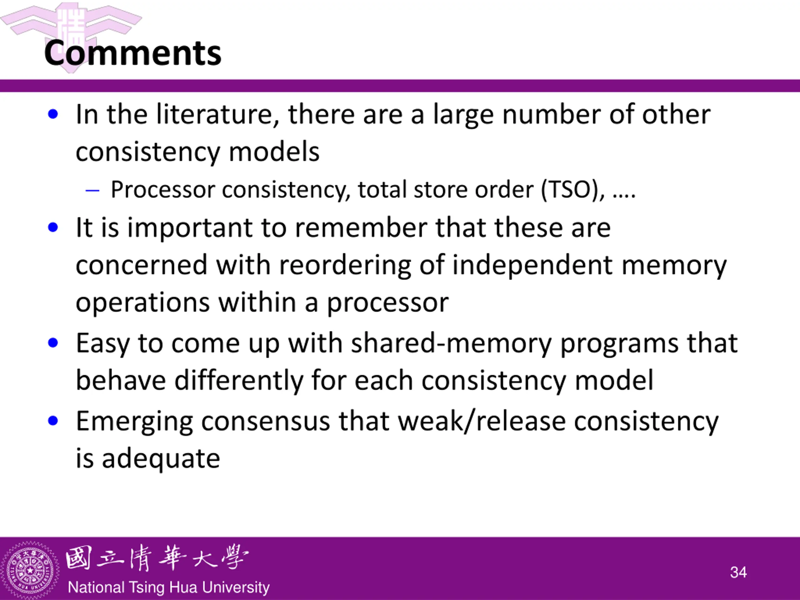 Comments In the literature, there are a large number of other consistency models Processor consistency, total store order (TSO), . It is important to remember that these are concerned with reordering of independent memory operations within a processor Easy to come up with shared-memory programs that behave differently for each consistency model Emerging consensus that weak/release consistency is adequate 34 National Tsing Hua University
