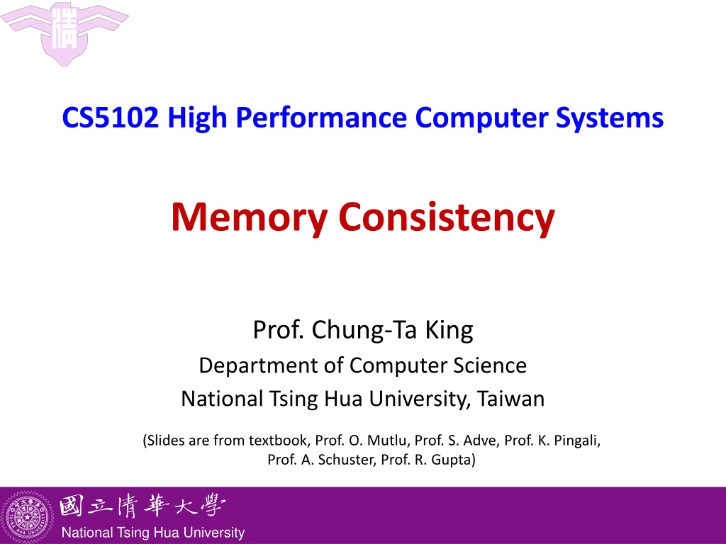 CS5102 High Performance Computer Systems Memory Consistency Prof. Chung-Ta King Department of Computer Science National Tsing Hua University, Taiwan (Slides are from textbook, Prof. O. Mutlu, Prof. S. Adve, Prof. K. Pingali, Prof. A. Schuster, Prof. R. Gupta) National Tsing Hua University