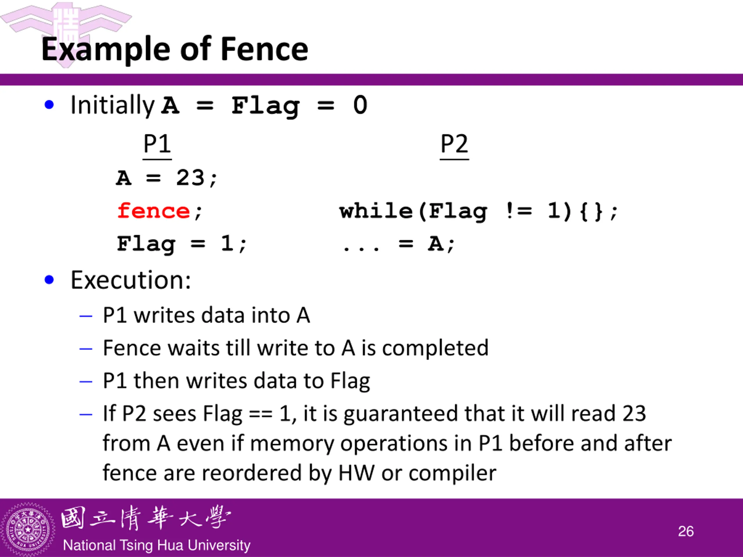 Example of Fence Initially A = Flag = 0 P1 A = 23; fence; Flag = 1; Execution: P1 writes data into A Fence waits till write to A is completed P1 then writes data to Flag If P2 sees Flag == 1, it is guaranteed that it will read 23 from A even if memory operations in P1 before and after fence are reordered by HW or compiler P2 while(Flag != 1){}; ... = A; 26 National Tsing Hua University