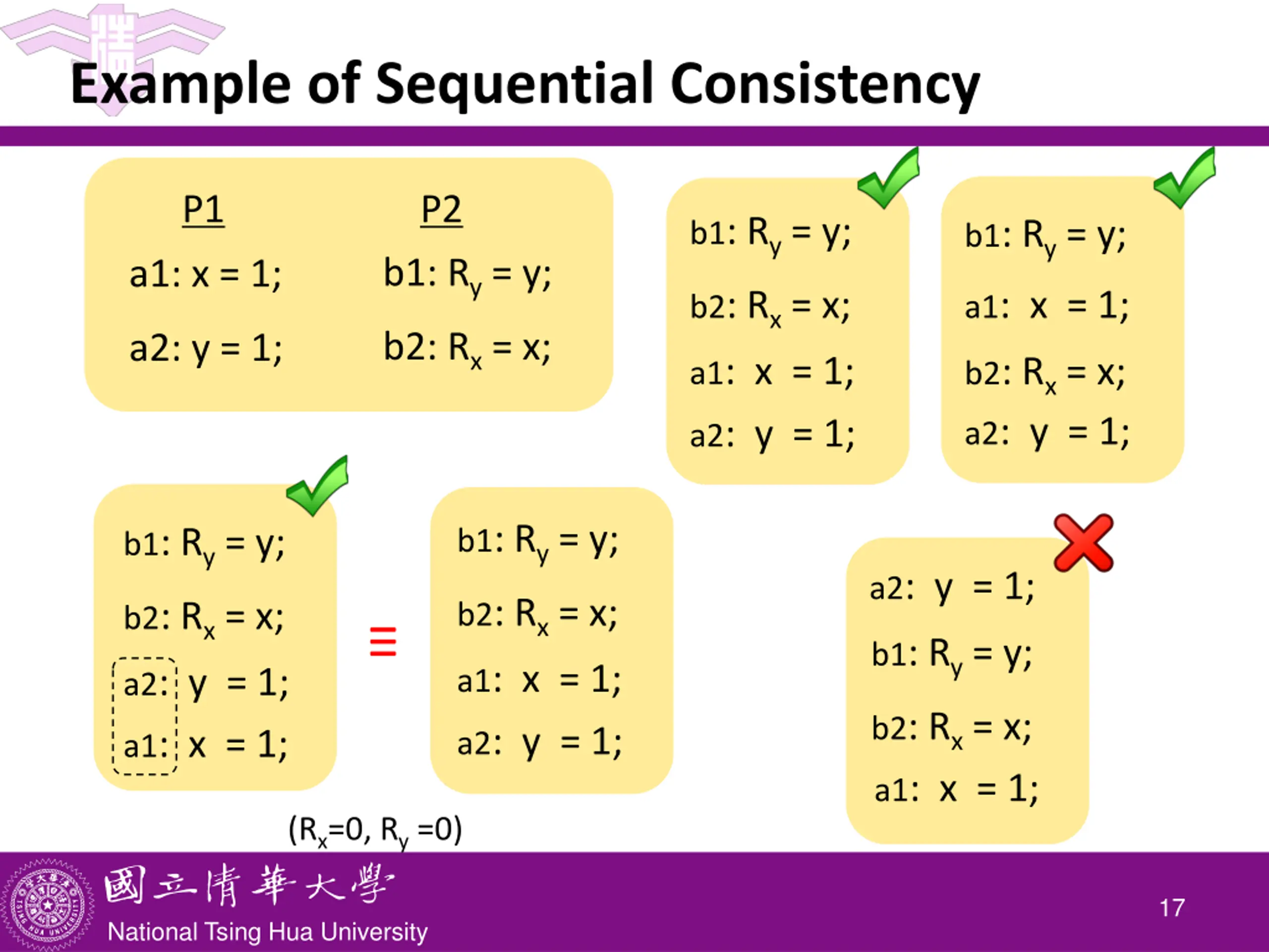 Example of Sequential Consistency P1 P2 b1: Ry = y; b1: Ry = y; b1: Ry = y; a1: x = 1; b2: Rx = x; a1: x = 1; a1: x = 1; b2: Rx = x; a2: y = 1; b2: Rx = x; a2: y = 1; a2: y = 1; b1: Ry = y; b1: Ry = y; a2: y = 1; b2: Rx = x; a1: x = 1; b2: Rx = x; a2: y = 1; b1: Ry = y; b2: Rx = x; a1: x = 1; a2: y = 1; a1: x = 1; (Rx=0, Ry =0) 17 National Tsing Hua University
