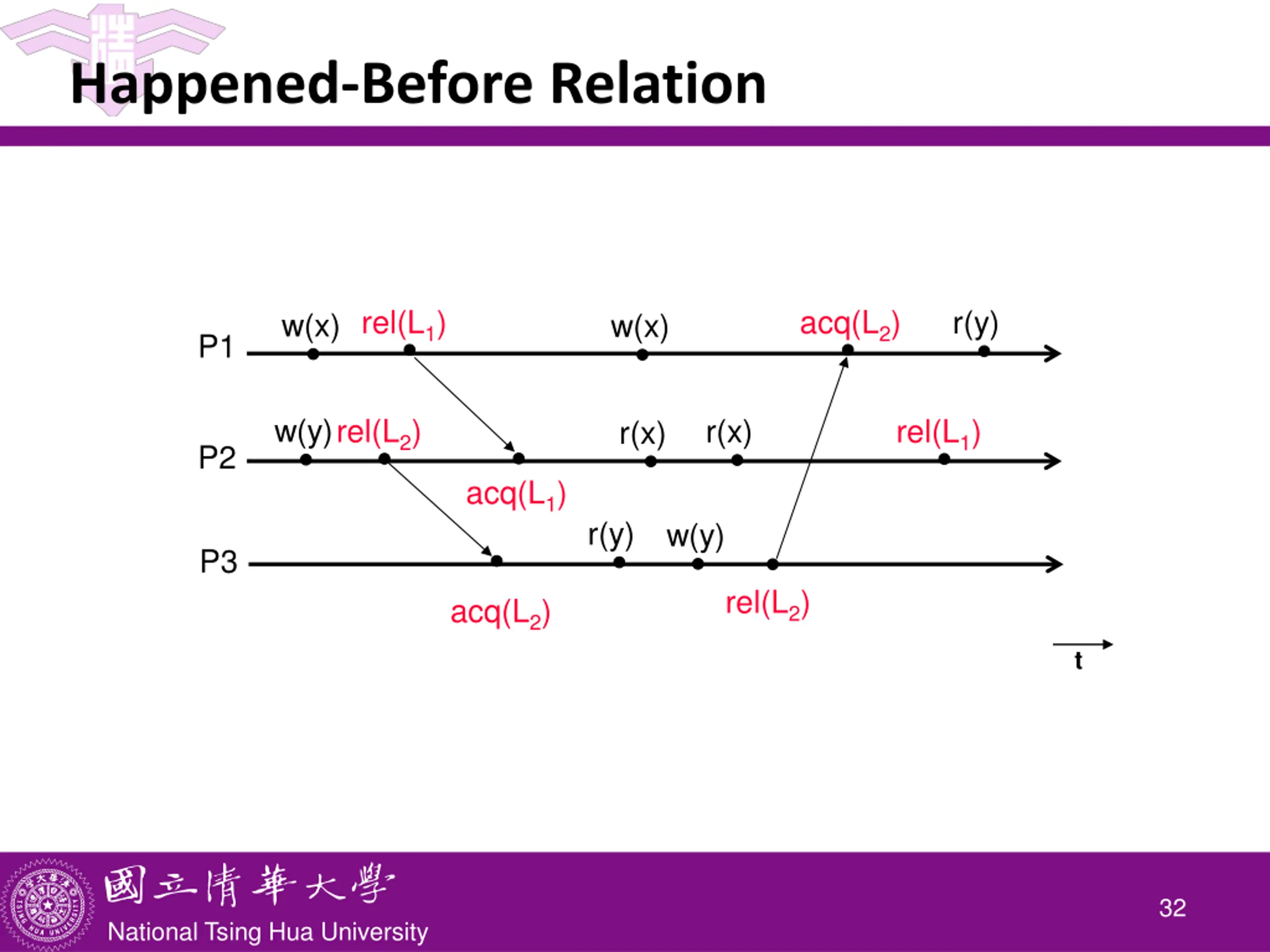 Happened-Before Relation rel(L1) acq(L2) r(y) w(x) w(x) P1 w(y) rel(L2) r(x) rel(L1) r(x) P2 acq(L1) r(y) w(y) P3 rel(L2) acq(L2) t 32 National Tsing Hua University