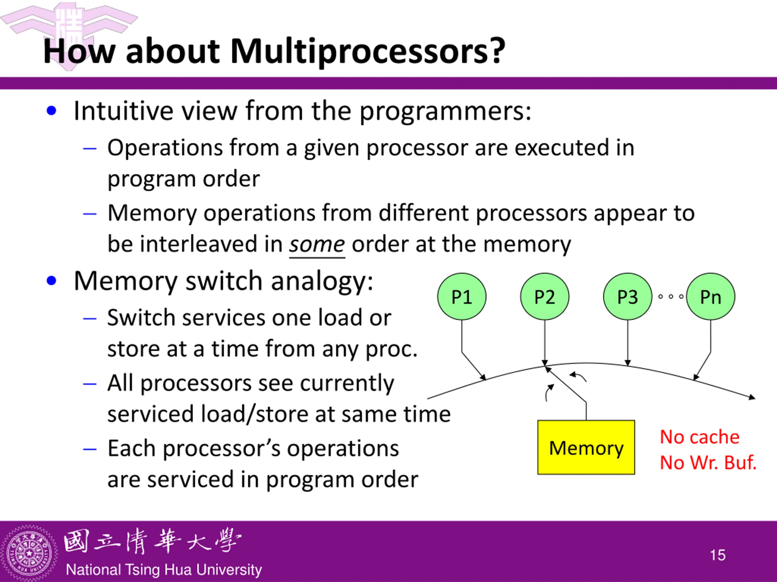 How about Multiprocessors? Intuitive view from the programmers: Operations from a given processor are executed in program order Memory operations from different processors appear to be interleaved in some order at the memory Memory switch analogy: Switch services one load or store at a time from any proc. All processors see currently serviced load/store at same time Each processor s operations are serviced in program order P1 P2 P3 Pn No cache No Wr. Buf. Memory 15 National Tsing Hua University