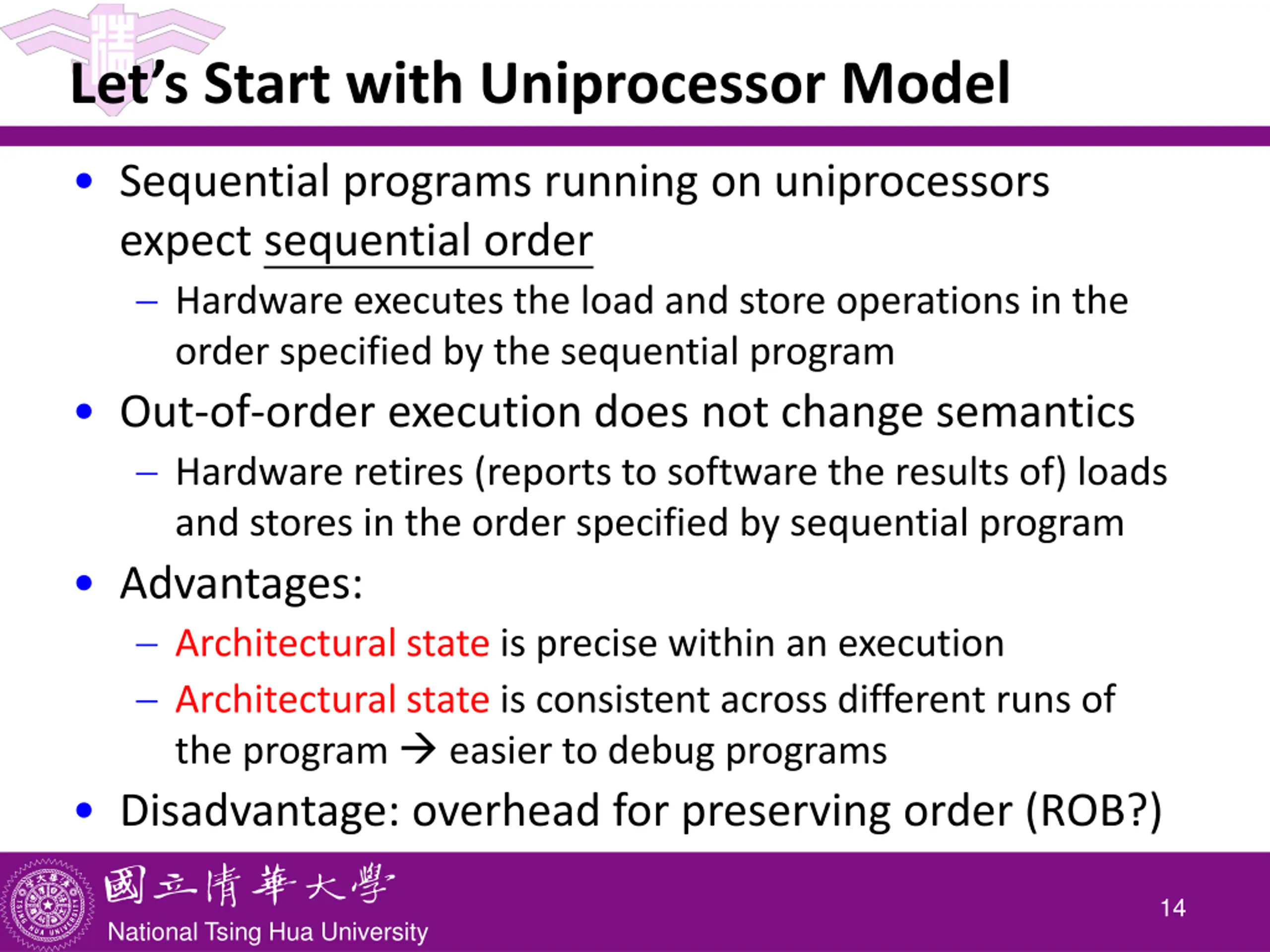 Lets Start with Uniprocessor Model Sequential programs running on uniprocessors expect sequential order Hardware executes the load and store operations in the order specified by the sequential program Out-of-order execution does not change semantics Hardware retires (reports to software the results of) loads and stores in the order specified by sequential program Advantages: Architectural state is precise within an execution Architectural state is consistent across different runs of the program easier to debug programs Disadvantage: overhead for preserving order (ROB?) 14 National Tsing Hua University