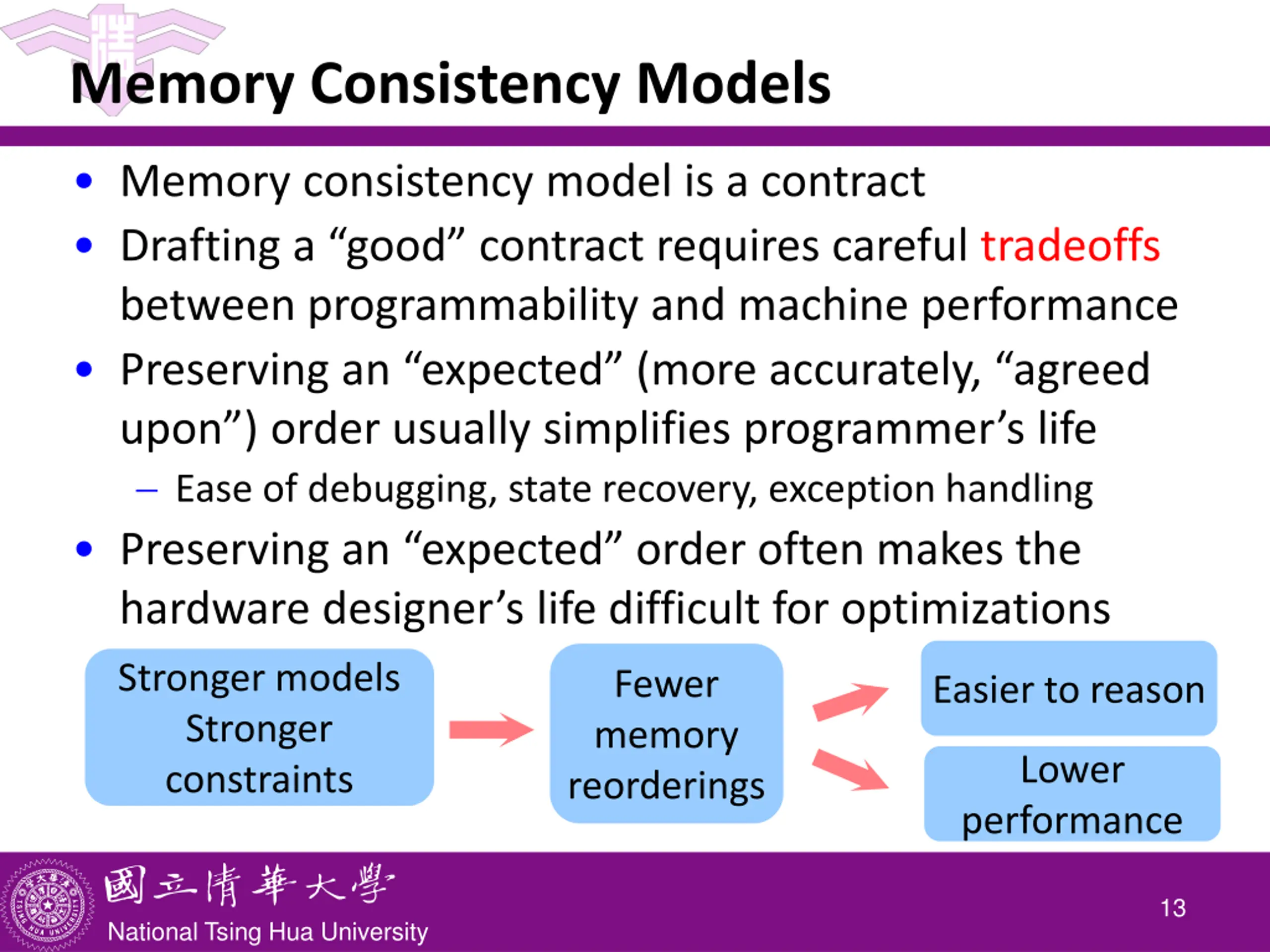 Memory Consistency Models Memory consistency model is a contract Drafting a good contract requires careful tradeoffs between programmability and machine performance Preserving an expected (more accurately, agreed upon ) order usually simplifies programmer s life Ease of debugging, state recovery, exception handling Preserving an expected order often makes the hardware designer s life difficult for optimizations Stronger models Stronger constraints Fewer memory reorderings Easier to reason Lower performance 13 National Tsing Hua University