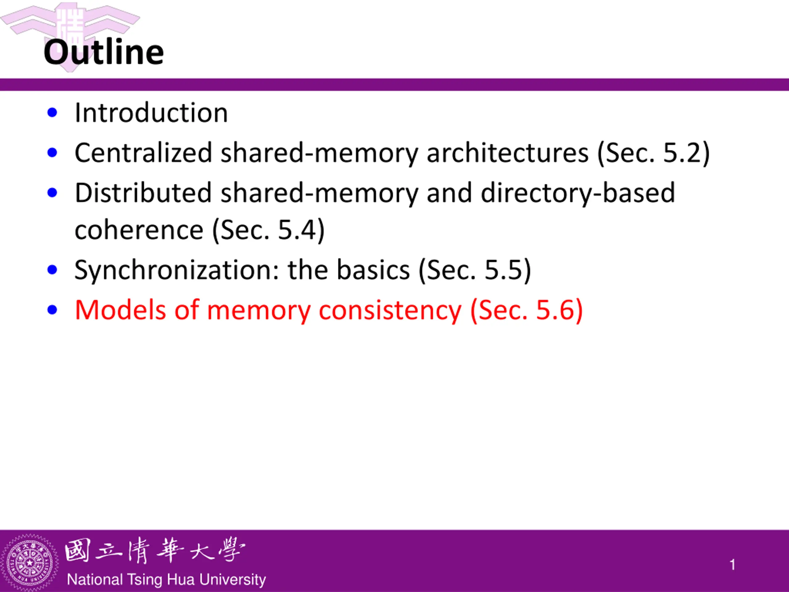 Outline Introduction Centralized shared-memory architectures (Sec. 5.2) Distributed shared-memory and directory-based coherence (Sec. 5.4) Synchronization: the basics (Sec. 5.5) Models of memory consistency (Sec. 5.6) 1 National Tsing Hua University