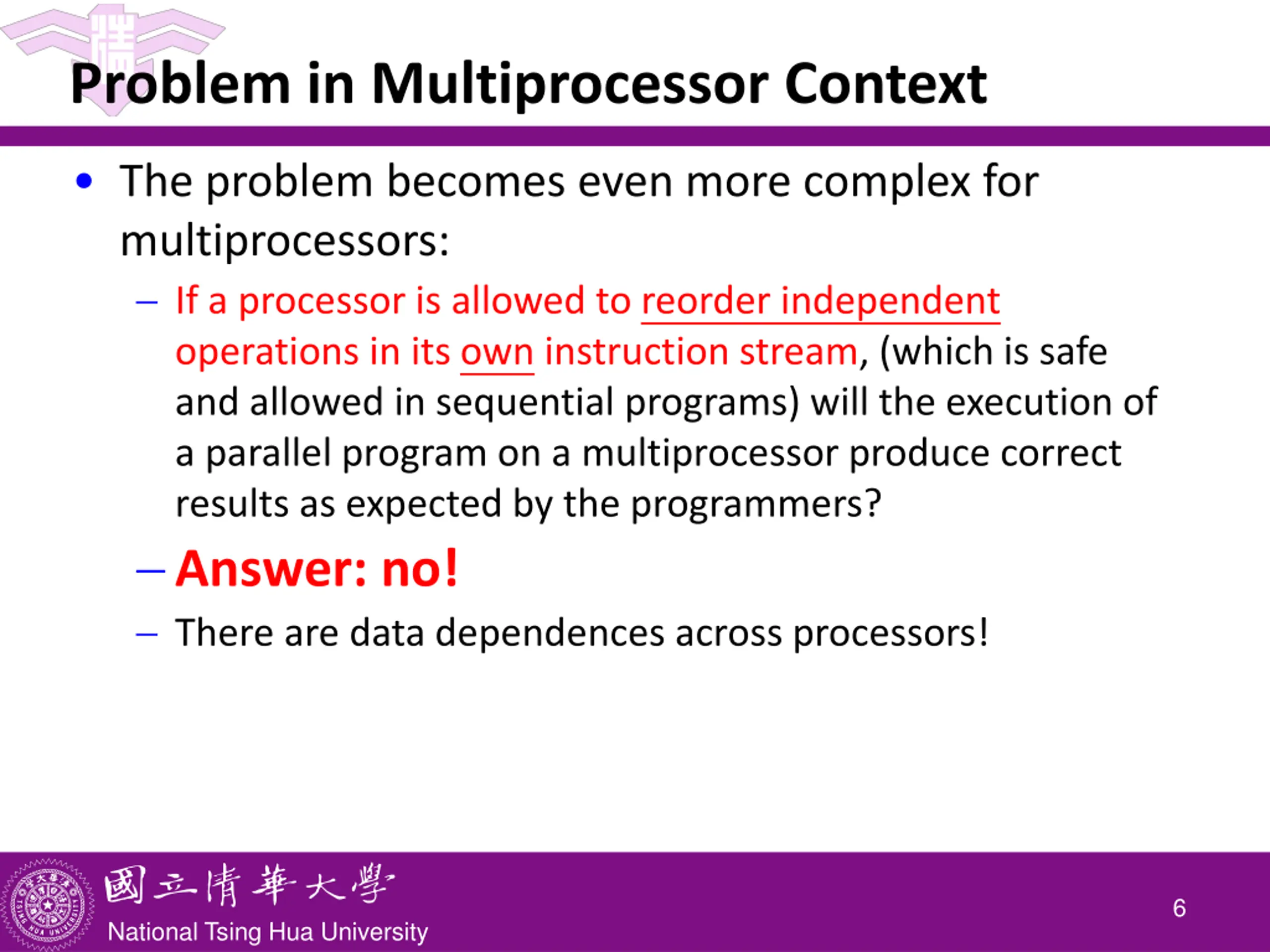 Problem in Multiprocessor Context The problem becomes even more complex for multiprocessors: If a processor is allowed to reorder independent operations in its own instruction stream, (which is safe and allowed in sequential programs) will the execution of a parallel program on a multiprocessor produce correct results as expected by the programmers? Answer: no! There are data dependences across processors! 6 National Tsing Hua University