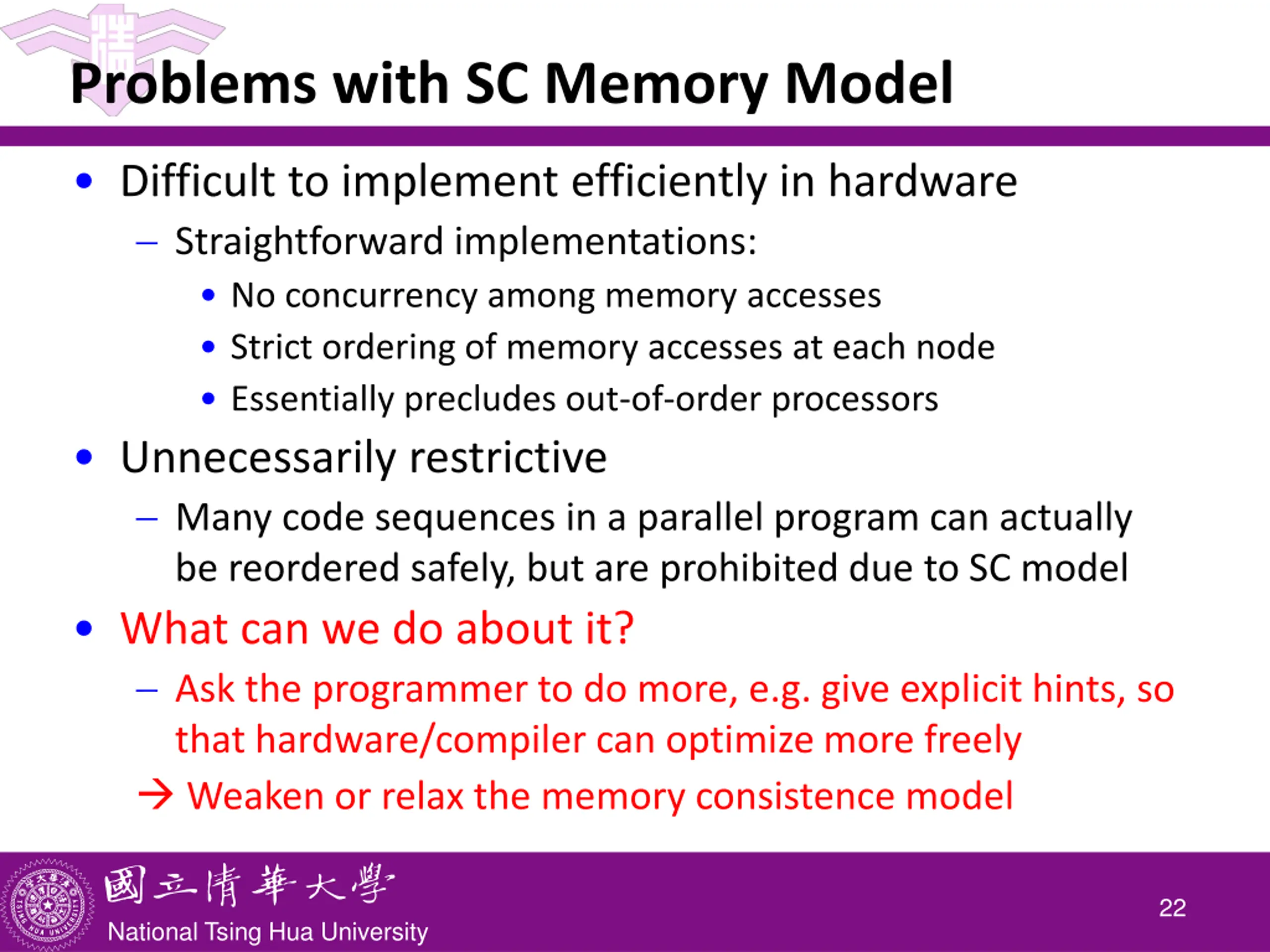 Problems with SC Memory Model Difficult to implement efficiently in hardware Straightforward implementations: No concurrency among memory accesses Strict ordering of memory accesses at each node Essentially precludes out-of-order processors Unnecessarily restrictive Many code sequences in a parallel program can actually be reordered safely, but are prohibited due to SC model What can we do about it? Ask the programmer to do more, e.g. give explicit hints, so that hardware/compiler can optimize more freely Weaken or relax the memory consistence model 22 National Tsing Hua University