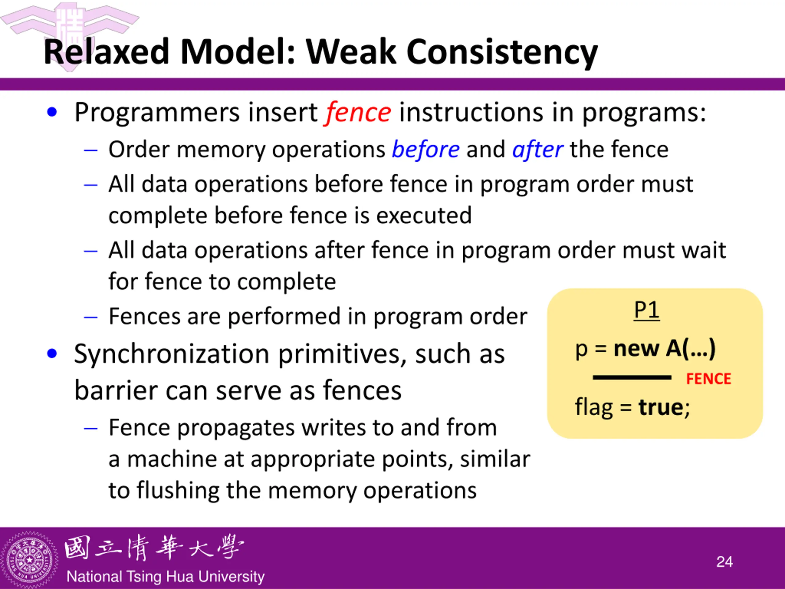 Relaxed Model: Weak Consistency Programmers insert fence instructions in programs: Order memory operations before and after the fence All data operations before fence in program order must complete before fence is executed All data operations after fence in program order must wait for fence to complete Fences are performed in program order Synchronization primitives, such as barrier can serve as fences Fence propagates writes to and from a machine at appropriate points, similar to flushing the memory operations P1 p = new A( ) FENCE flag = true; 24 National Tsing Hua University