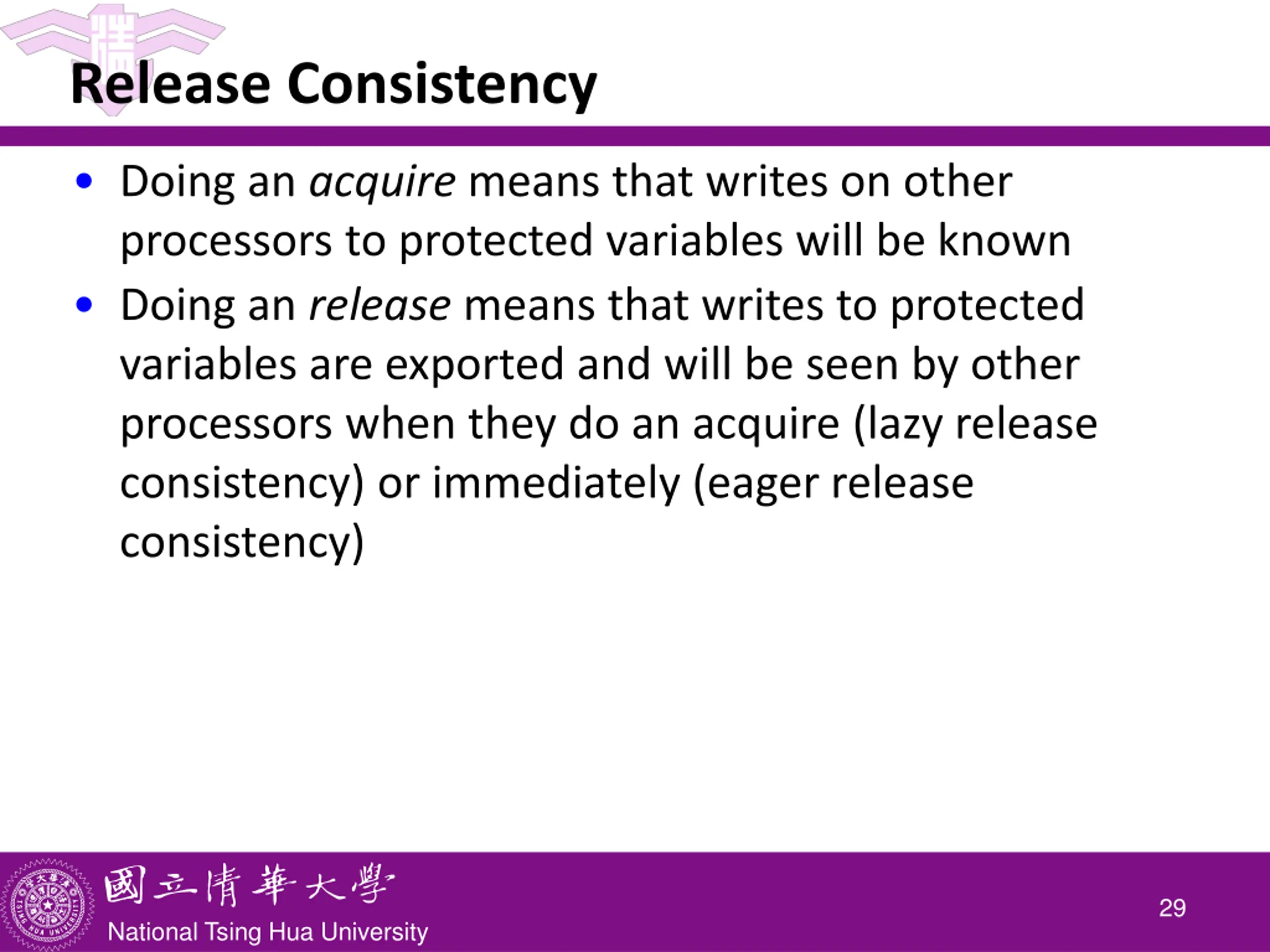 More Relaxed Model: Release Consistency Divide fence into two: one guard against before and the other against after Acquire: must complete (acquired) before all following memory accesses, e.g. operations like lock Release: can proceed only after all memory operations before release are completed (released), e.g. operations like unlock However, Acquire does not wait for memory accesses preceding it Memory accesses after release in program order do not have to wait for release K. Gharachorloo, D. Lenoski, J. Laudon, P. Gibbons, A. Gupta, and J.L. Hennessy. Memory consistency and event ordering in scalable shared-memory multiprocessors. In Proceedings of the 17th Annual International Symposium on Computer Architecture, pages 15--26. May 1990. 28 National Tsing Hua University