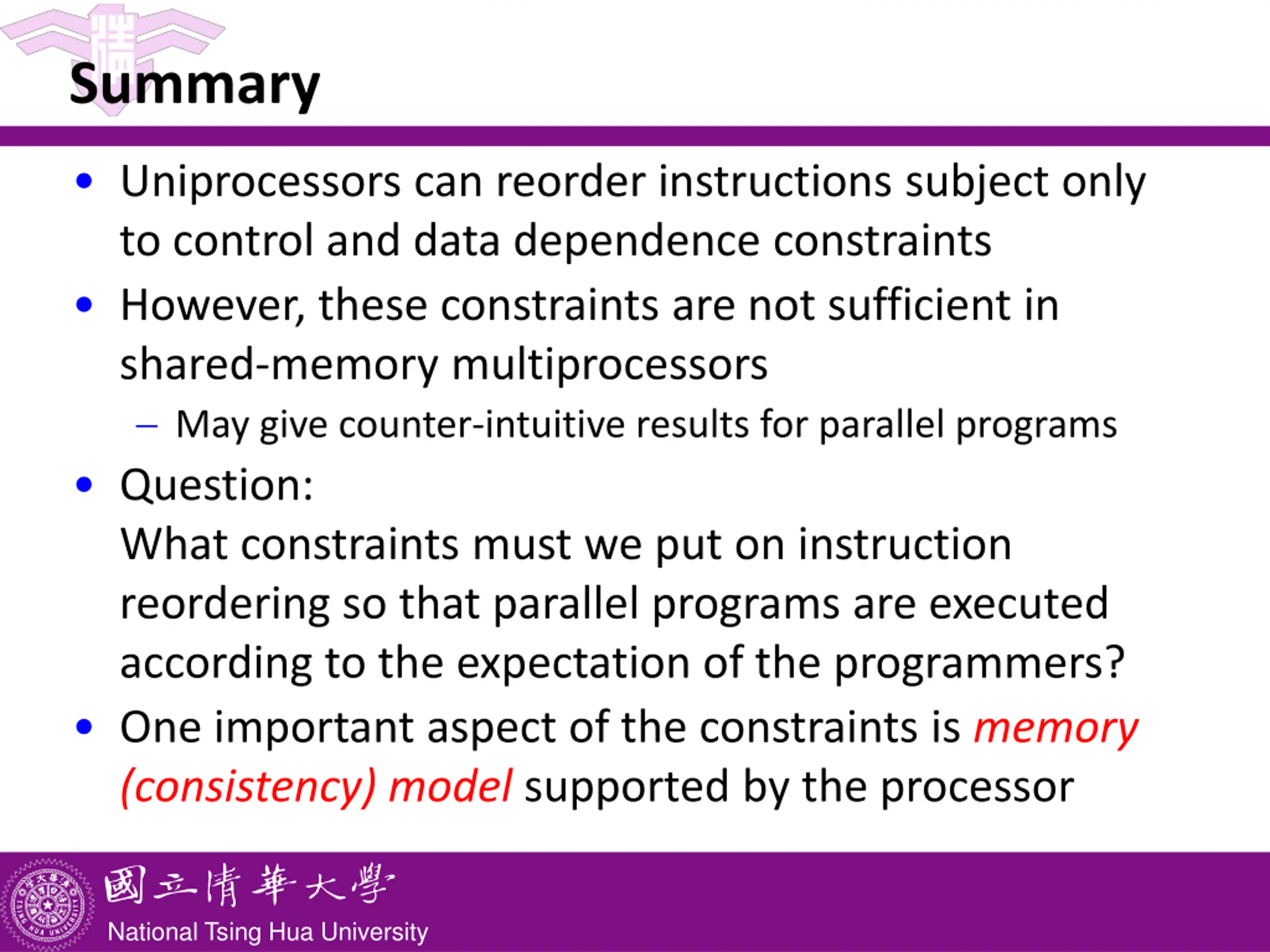 Summary Uniprocessors can reorder instructions subject only to control and data dependence constraints However, these constraints are not sufficient in shared-memory multiprocessors May give counter-intuitive results for parallel programs Question: What constraints must we put on instruction reordering so that parallel programs are executed according to the expectation of the programmers? One important aspect of the constraints is memory (consistency) model supported by the processor National Tsing Hua University