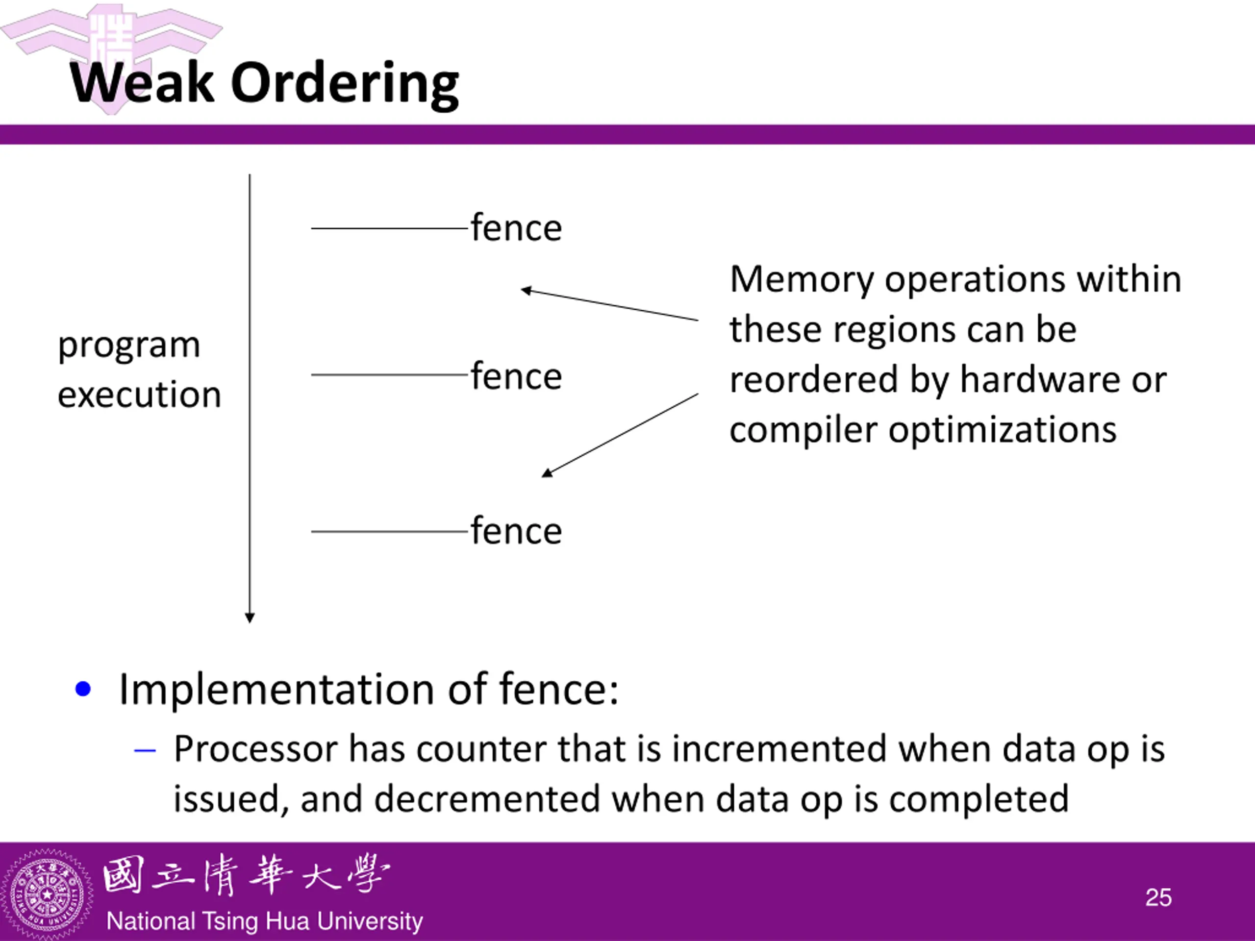 Weak Ordering fence Memory operations within these regions can be reordered by hardware or compiler optimizations program execution fence fence Implementation of fence: Processor has counter that is incremented when data op is issued, and decremented when data op is completed 25 National Tsing Hua University