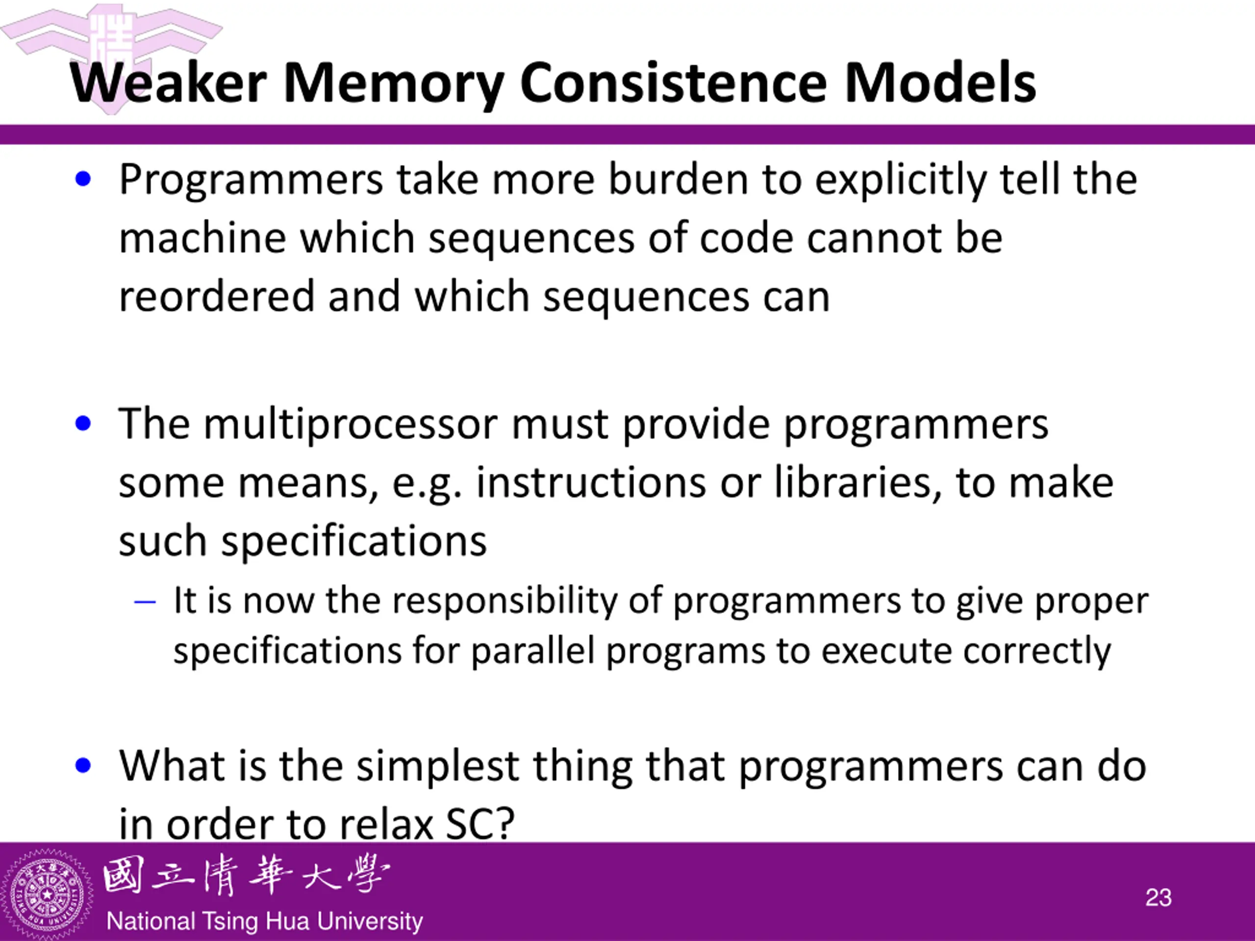 Weaker Memory Consistence Models Programmers take more burden to explicitly tell the machine which sequences of code cannot be reordered and which sequences can The multiprocessor must provide programmers some means, e.g. instructions or libraries, to make such specifications It is now the responsibility of programmers to give proper specifications for parallel programs to execute correctly What is the simplest thing that programmers can do in order to relax SC? 23 National Tsing Hua University