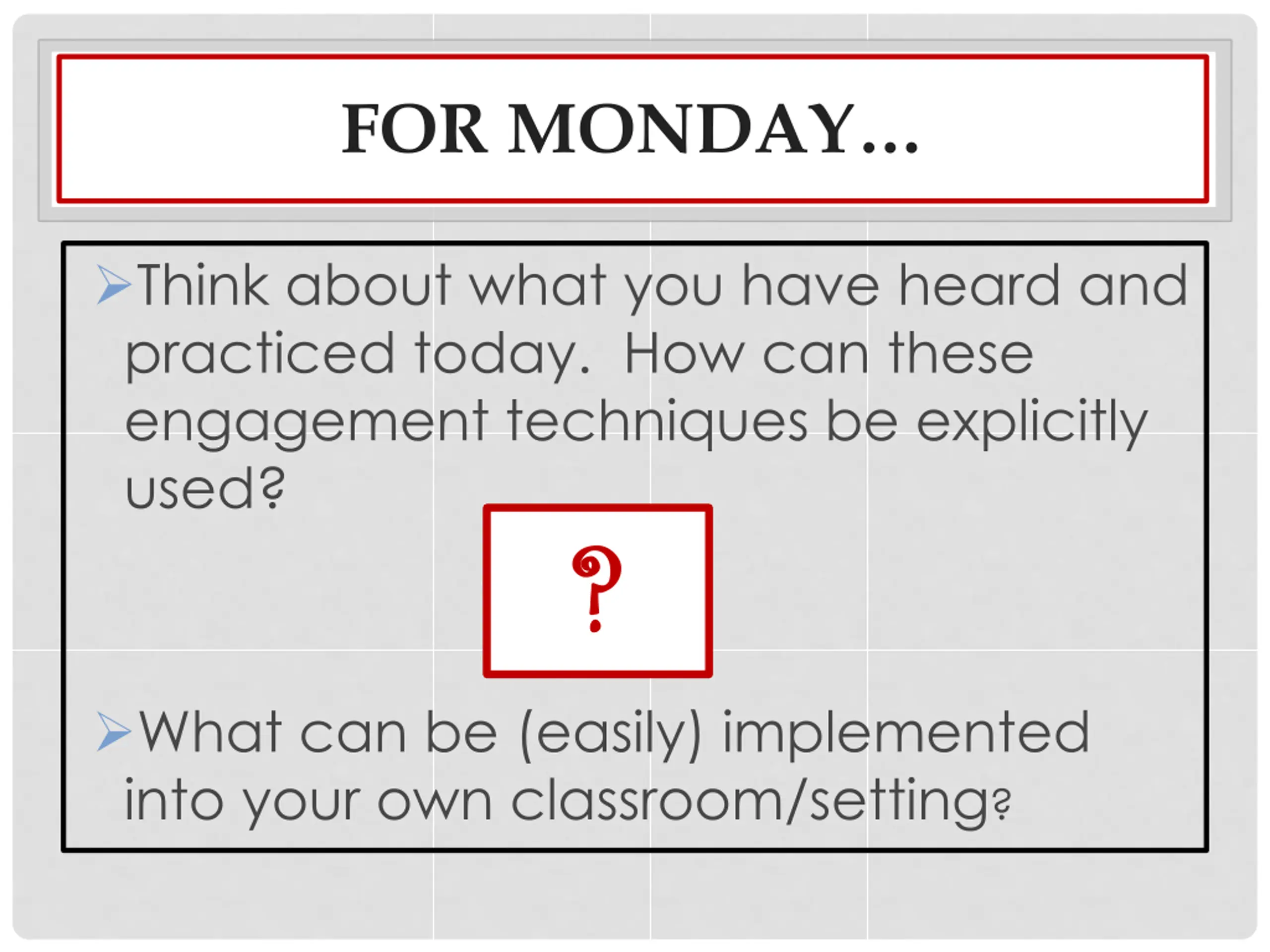 FOR MONDAY Think about what you have heard and practiced today. How can these engagement techniques be explicitly used? ? ? What can be (easily) implemented into your own classroom/setting?