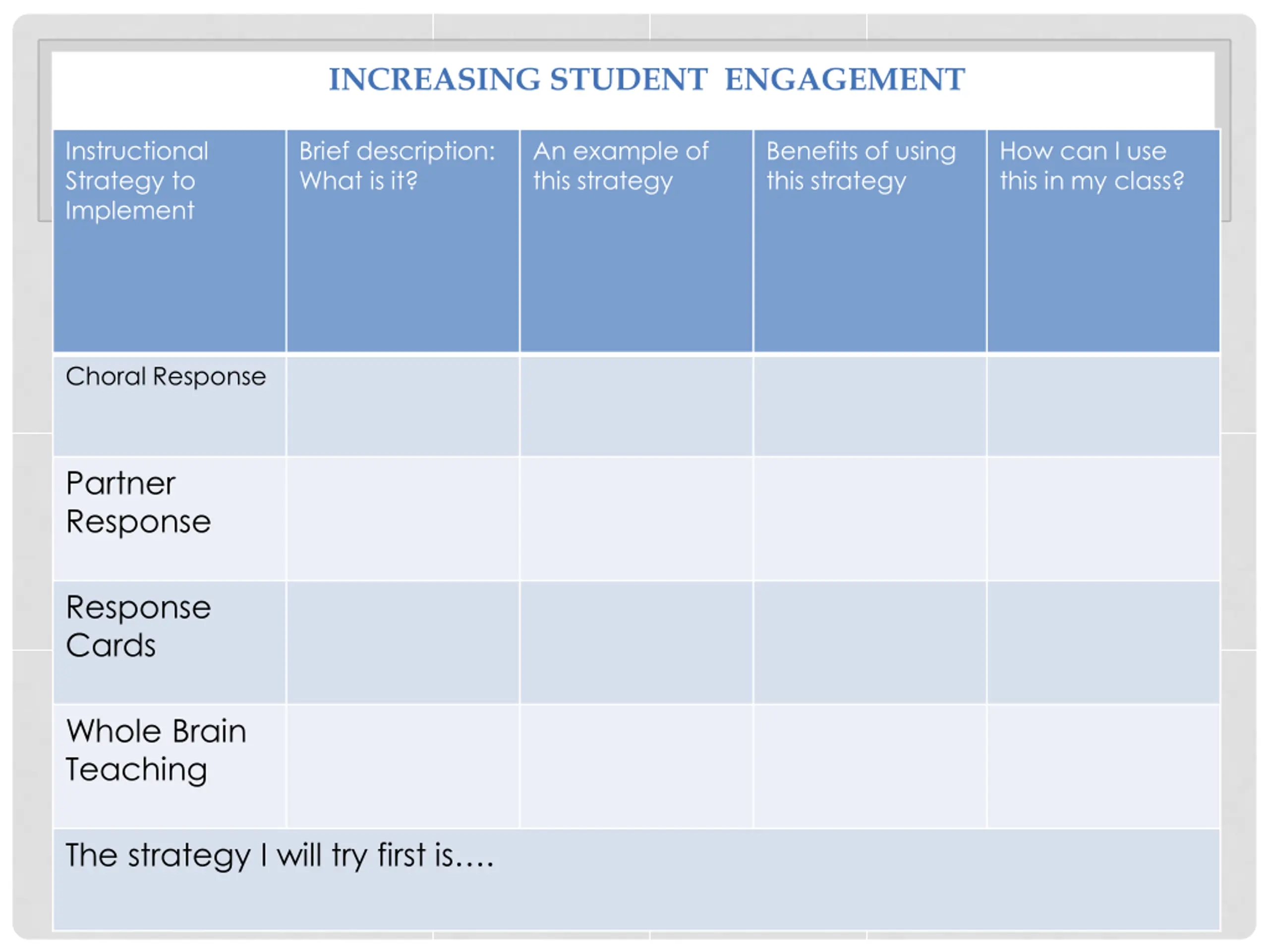 INCREASING STUDENT ENGAGEMENT Instructional Strategy to Implement Brief description: What is it? An example of this strategy Benefits of using this strategy How can I use this in my class? Choral Response Partner Response Response Cards Whole Brain Teaching The strategy I will try first is .