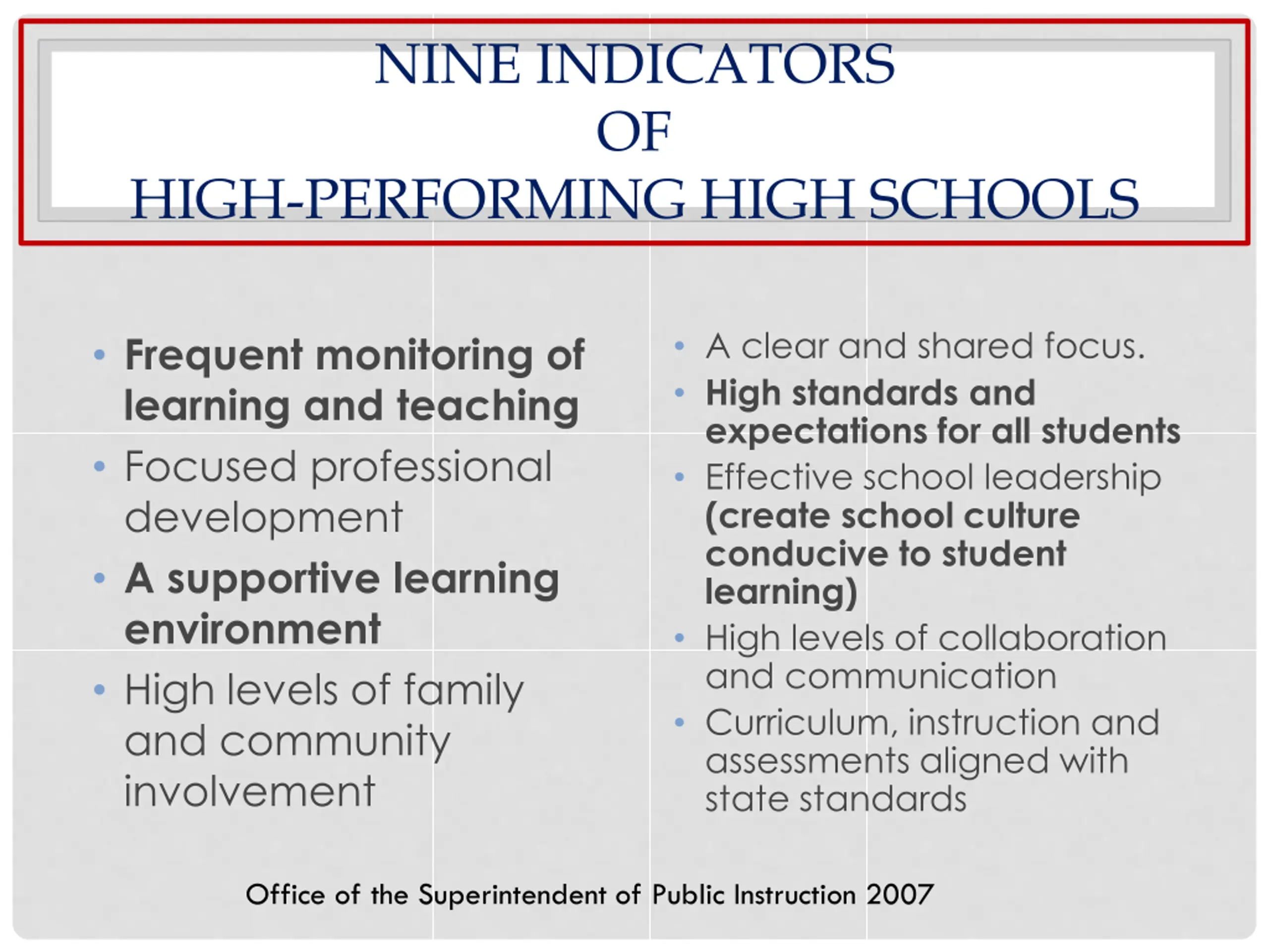 NINE INDICATORS OF HIGH-PERFORMING HIGH SCHOOLS A clear and shared focus. High standards and expectations for all students Effective school leadership (create school culture conducive to student learning) High levels of collaboration and communication Curriculum, instruction and assessments aligned with state standards Frequent monitoring of learning and teaching Focused professional development A supportive learning environment High levels of family and community involvement Office of the Superintendent of Public Instruction 2007